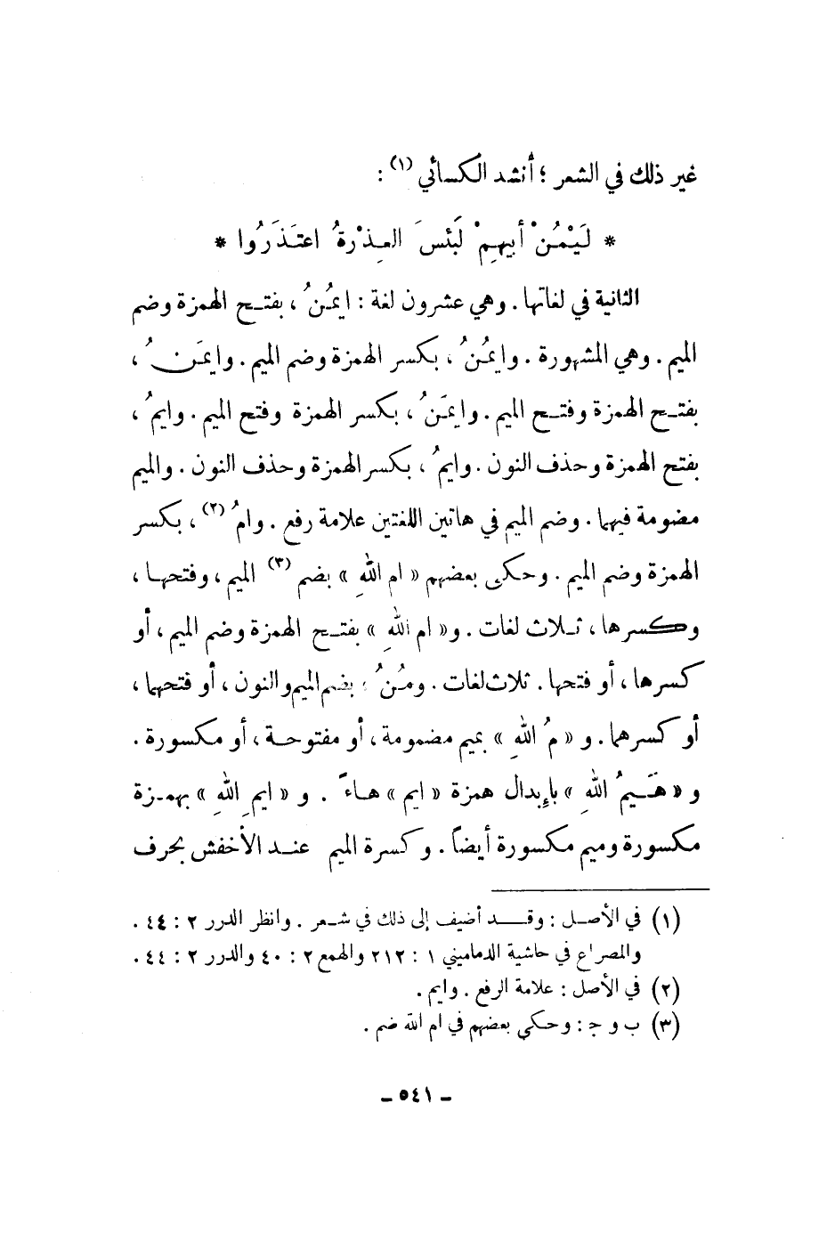 الثانية في لغاتها. وهي عشرون لغة: أيمن، بفتح الهمزة وضم الميم. وهي المشهورة. وأيمن، بكسر الهمزة وضم الميم. وهي المشهورة. وأيمن، بكسر الهمزة وضم الميم. وايمن، بفتح الهمزة وفتح الميم. وأيم، بفتح الهمزة وحذف النون. وأيم، بكسر الهمزة وحذف النون. والميم مضمومة فيهما. وضم الميم في هاتين اللغتين علامة رفع. وام، بكسر الهمزة وضم الميم. وحكى بعضهم أم الله بضم الميم، وفتحها، وكسرها، ثلاث لغات. وأم الله بفتح الهمزة وضم الميم، أو كسرها، أو فتحها. ثلاث لغات. وأم الله بفتح الهمزة وضم الميم، أو كسرها، أو فتحها. ثلاث لغات. ومن، بضم الميم والنون، أو فتحهما، أو كسرهما. وم الله بميم مضمومة، أو مفتوحة، أو مكسورة. وهيم الله بإبدال همزة أيم هاء. وأيم الله بهمزة مكسورة وميم مكسورة أيضاً. وكسرة الميم عند الأخفش بحرف