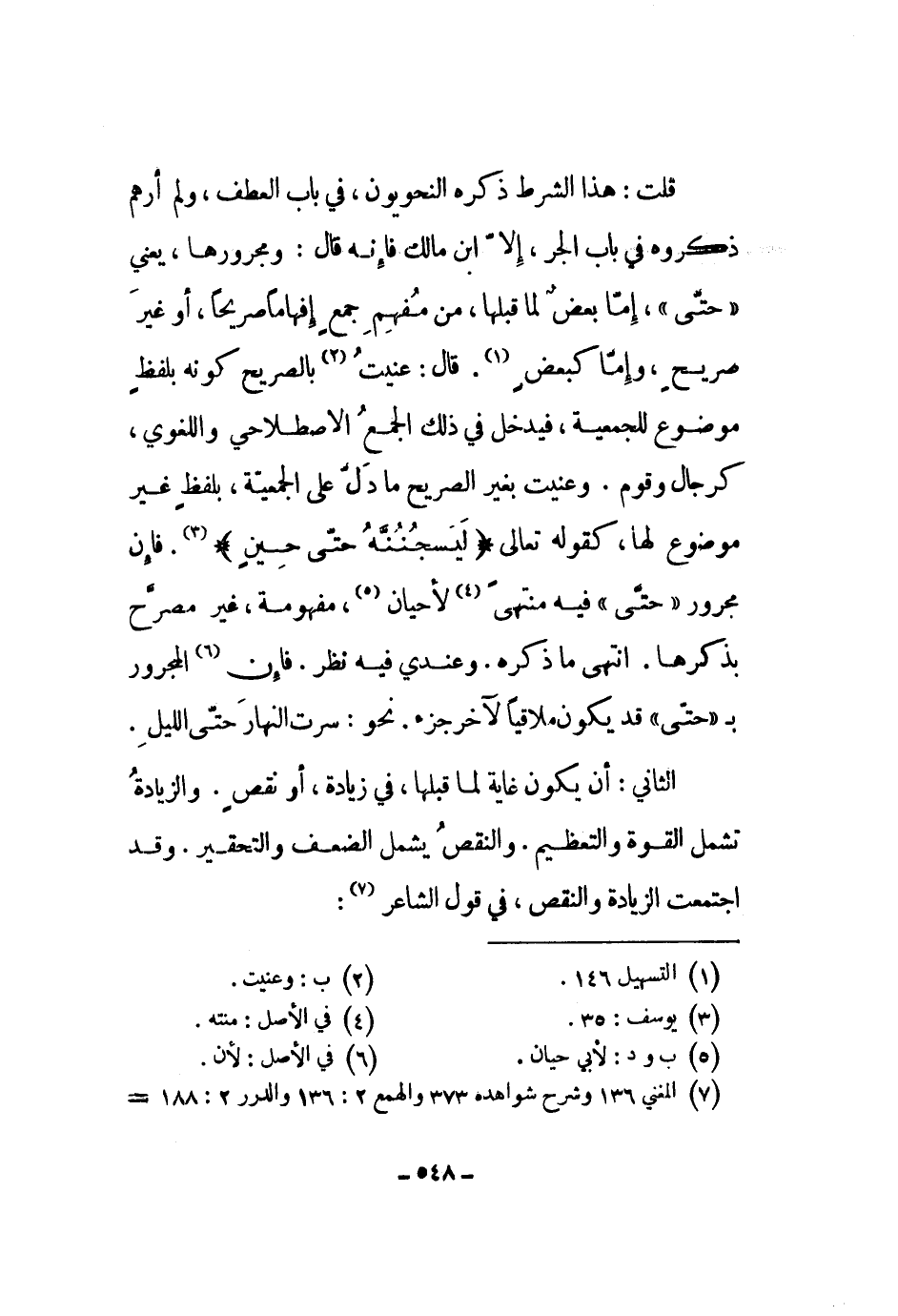 قلت: هذا الشرط ذكره النحويون، في باب العطف، ولم أرهم ذكروه في باب الجر، إلا ابن مالك فإنه قال: ومجرورها، يعني حتى، إما بعض لما قبلها، من مفهم جمع إفهاماً صريحاً، أو غير صريح، وإما كبعض. قال: عنيت بالصريح كونه بلفظ موضوع للجمعية، فيدخل في ذلك الجمع الاصطلاحي واللغوي، كرجال وقوم. وعنيت بغير الصريح ما دل على الجمعية، بلفظ غير لها، كقوله تعالى " ليسجننه حتى حين ". فإن مجرور حتى فيه منتهى لأحيان، مفهومة، غير مصرح بذكرها. انتهى ما ذكره. وعندي فيه نظر. فإن المجرور بحتى قد يكون ملاقياً لآخر جزء. نحو: سرت النهار حتى الليل.