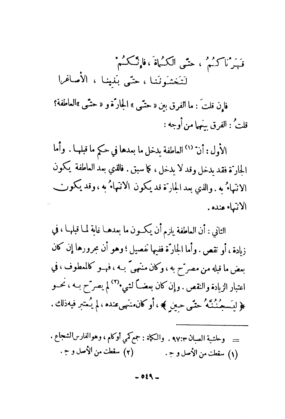 الثاني: أن العاطفة يلزم أن يكون ما بعدها غاية لما قبلها، في زيادة، أو نقص. وأما الجارة ففيها تفصيل؛ وهو أن مجرورها إن كان بعض ما قبله من مصرح به، وكان منتهى به، فهو كالمعطوف، في اعتبار الزيادة والنقص. وإن كان بعضاً لشيء لم يصرح به، نحو " ليسجننه حتى حين "، أو كان منتهى عنده، لم يعتبر فيه ذلك.