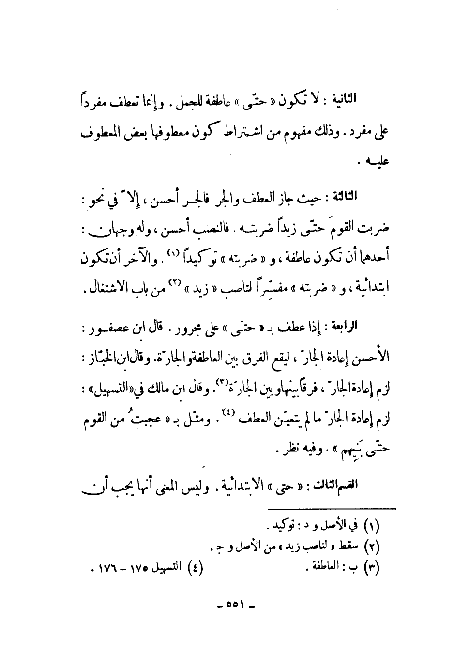 الرابعة: إذا عطف بحتى على مجرور. قال ابن عصفور: الأحسن إعادة الجار، ليقع الفرق بين العاطفة والجارة. وقال ابن الخباز: لزم إعادة الجار، فرقاً بينها وبين الجارة. وقال ابن مالك في التسهيل: لزم إعادة الجار ما لم يتعين العطف. ومثل بعجبت من القوم حتى بنيهم. وفيه نظر.