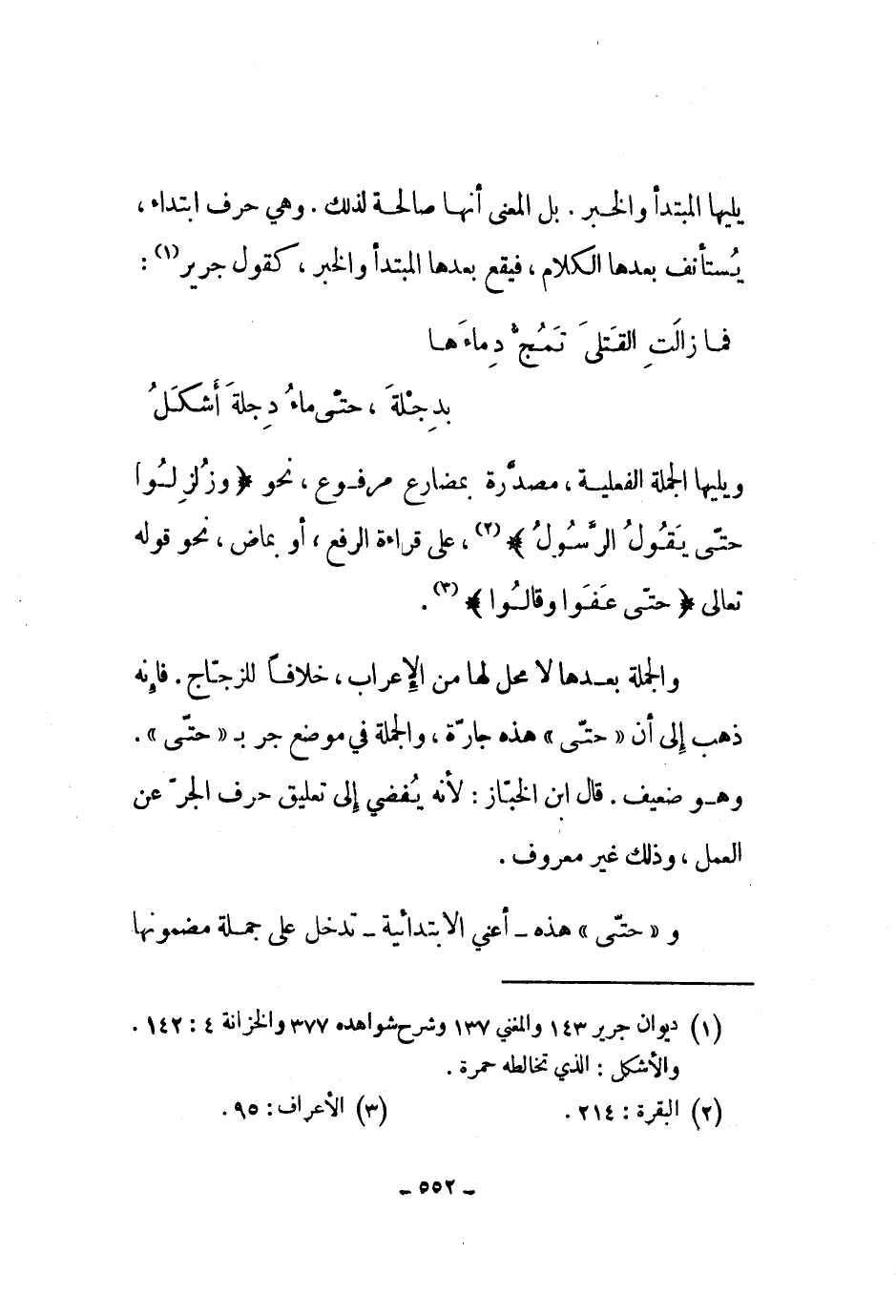 والجملة بعدها لا محل لها من الإعراب، خلافاً للزجاج. فإنه ذهب إلى أن حتى هذه جارة، والجملة في موضع جر بحتى. وهو ضعيف. قال ابن الخباز: لأنه يفضي إلى تعليق حرف الجر عن العمل، وذلك غير معروف.