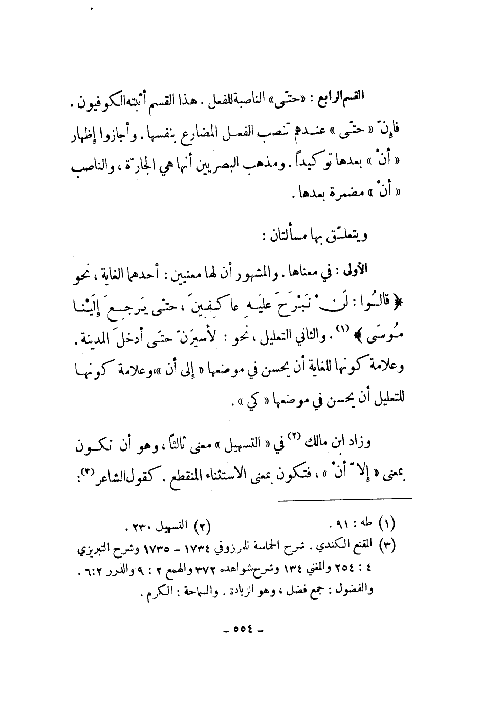 القسم الرابع: حتى الناصبة للفعل. هذا القسم أثبته الكوفيون. فإن حتى عندهم تنصب الفعل المضارع بنفسها. وأجازوا إظهار أن بعدها توكيداً. ومذهب البصريين أنها هي الجارة، والناصب أن مضمرة بعدها.