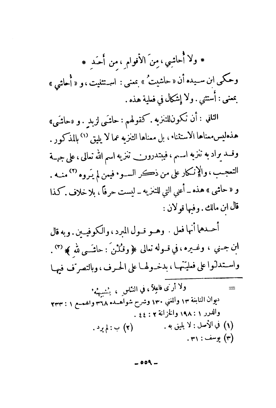 الثاني: أن تكون للتنزيه. كقوله: حاشى لزيد. وحاشى هذه ليس معناها الاستثناء، بل معناها التنزيه عما لا يليق بالمذكور. وقد يراد به تنزيه اسم، فيبتدرون تنزيه اسم الله تعالى، على جهة التعجب، والإنكار على من ذكر السوء فيمن لم يروه منه. وحاشى هذه - أعني التي للتنزيه - ليست حرفاً، بلا خلاف. كذا قال ابن مالك. وفيها قولان: أحدهما أنها فعل. وهو قول المبرد، والكوفيين. وبه قال ابن جني، وغيره، في قوله تعالى " وقلن: حاشى لله ". واستدلوا على فعليتها، بدخولها على الحرف، وبالتصرف فيها