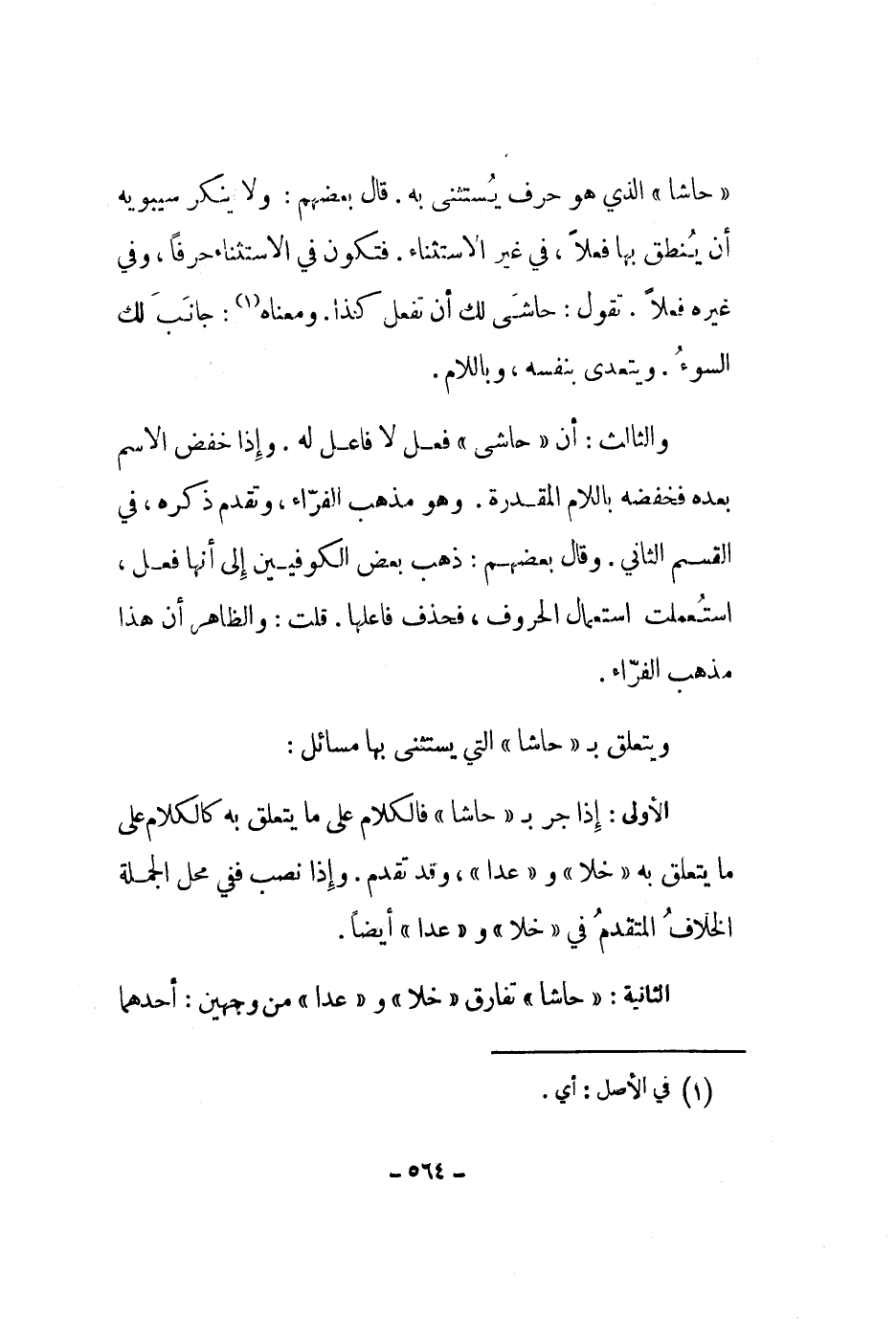 ويتعلق بحاشا التي يستثنى بها مسائل: الأولى: إذا جر بحاشا فالكلام على ما يتعلق به كالكلام على ما يتعلق به خلا وعدا، وقد تقدم. وإذا نصب ففي محل الجملة الخلاف المتقدم في خلا وعدا أيضاً.