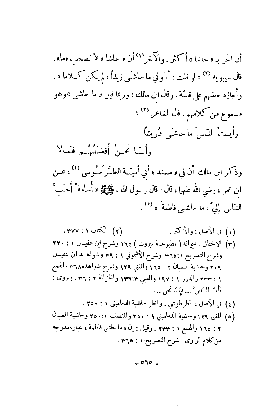 أن الجر بحاشا أكثر والآخر أن حاشا لا تصحب ما. قال سيبويه لو قلت: أتوني ما حاشى زيداً، لم يكن كلاماً. وأجازه بعضهم على قلة. وقال ابن مالك: وربما قيل ما حاشى وهو مسموع من كلامهم. قال الشاعر: