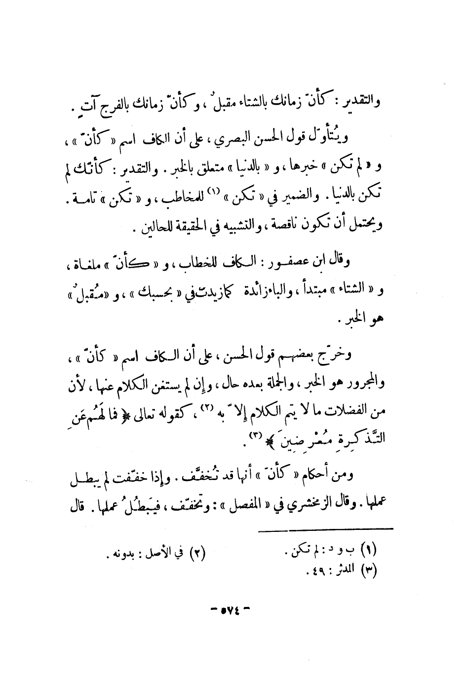 ويتأول قول الحسن البصري، على أن الكاف اسم كأن، ولم تكن خبرها، وبالدنيا متعلق بالخبر. والتقدير: كأنك لم تكن بالدنيا. والضمير في تكن للمخاطب، وتكن تامة. ويحتمل أن تكون ناقصة، والتشبيه في الحقيقة للحالين.