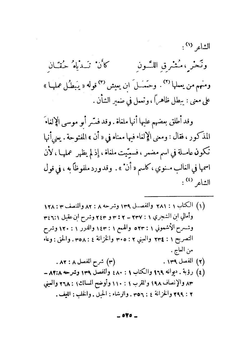 وقد أطلق بعضهم عليها أنها ملغاة. وقد فسر أبو موسى الإلغاء المذكور، فقال: ومعنى الإلغاء فيها معناه في أن المفتوحة. يعني أنها تكون عاملة في اسم مضمر، فسميت ملغاة، إذ لم يظهر عملها، لأن اسمها في الغالب منوي، كاسم أن. وقد ورد ملفوظاً به، في قول الشاعر: