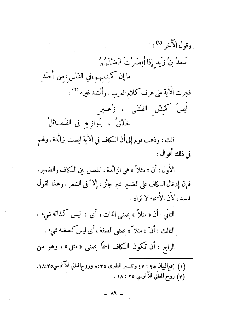 قلت: وذهب قوم إلى أن الكاف في الآية ليست بزائدة. ولهم في ذلك أقوال: الأول: أن مثلاً هي الزائدة، لتفصل بين الكاف والضمير. فإن إدخال الكاف على الضمير غير جائز، إلا في الشعر. وهذا القول فاسد، لأن الأسماء لا تزاد.