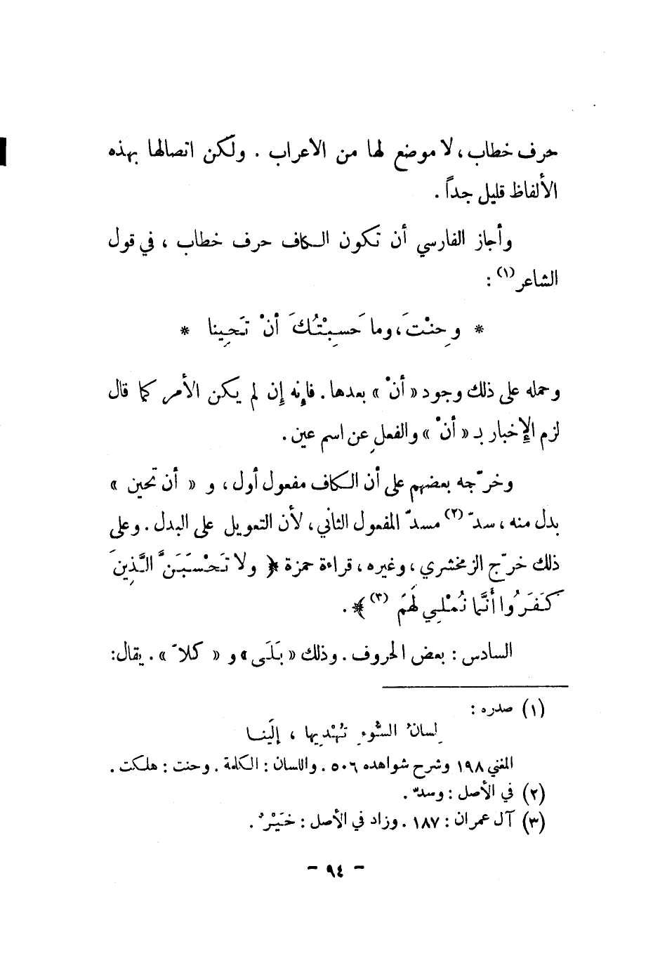وأجاز الفارسي أن تكون الكاف حرف خطاب، في قول الشاعر: وحنت، وما حسبتك أن تحينا وحمله على ذلك وجود أن بعدها. فإنه إن لم يكن الأمر كما قال لزم الإخبار ب أن والفعل عن اسم عين.