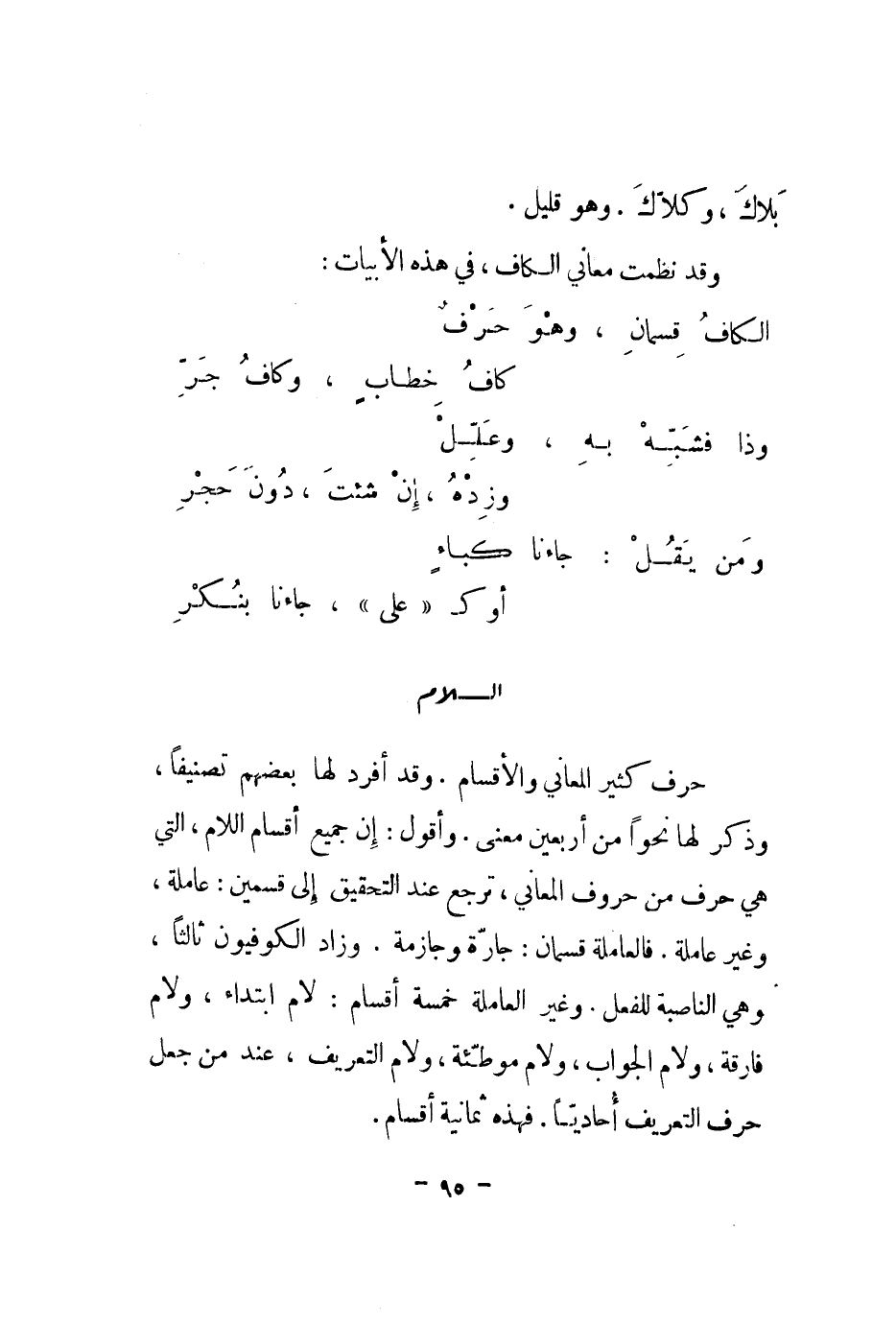 حرف كثير المعاني والأقسام. وقد أفرد لها بعضهم تصنيفاً، وذكر لها نحواً من أربعين معنى. وأقول: إن جميع أقسام اللام، التي هي حرف من حروف المعاني، ترجع عند التحقيق إلى قسمين: عاملة، وغير عاملة. فالعاملة قسمان: جارة وجازمة. وزاد الكوفيون ثالثاً، وهي الناصبة للفعل. وغير العاملة خمسة أقسام: لام ابتداء، ولام فارقة، ولام الجواب، ولام موطئة، ولام التعريف، عند من جعل حرف التعريف أحادياً. فهذه ثمانية أقسام.