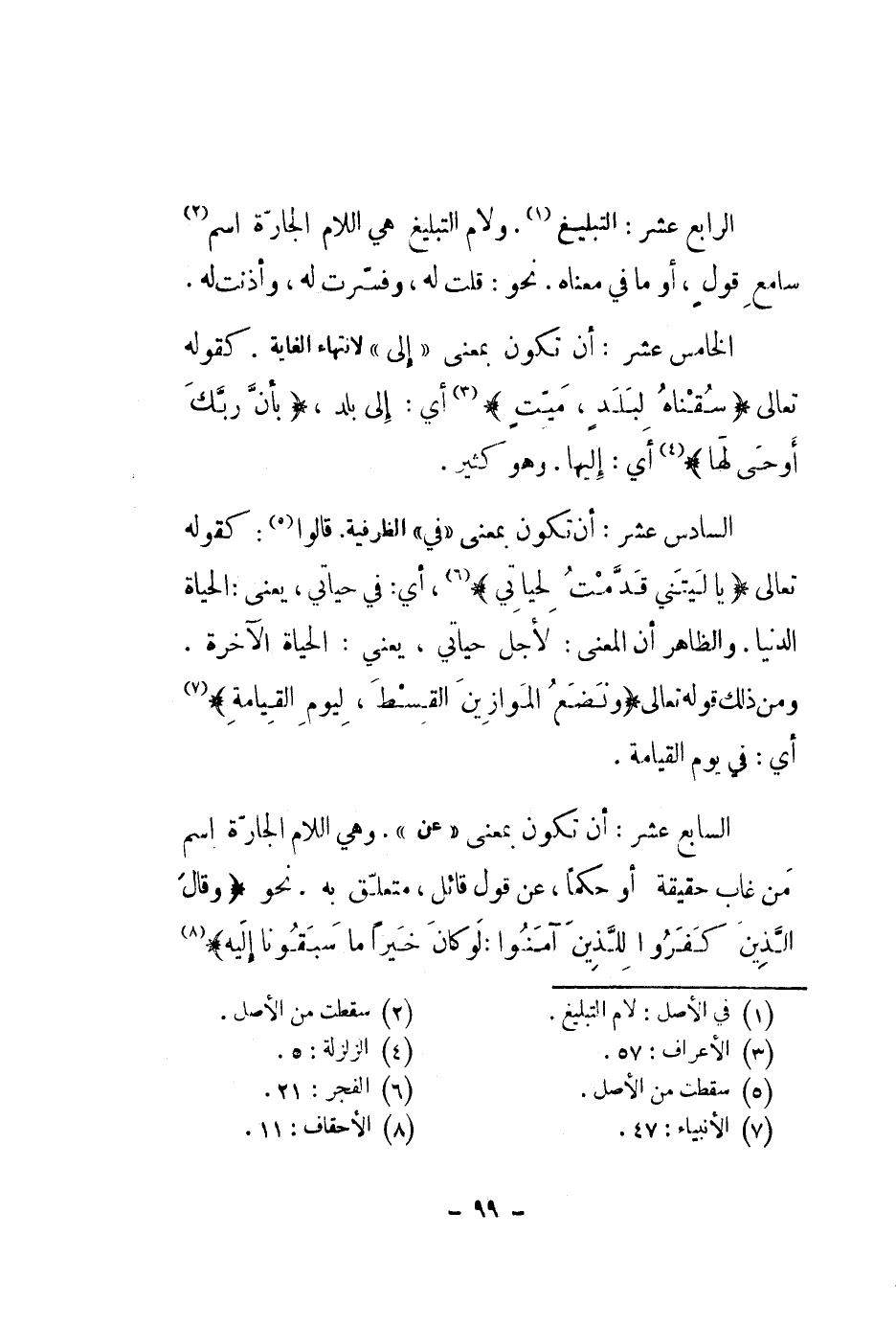 الخامس عشر: أن تكون بمعنى إلى لانتهاء الغاية. كقوله تعالى " سقناه لبلد، ميت " أي: إلى بلد، " بأن ربك أوحى لها " أي: إليها. وهو كثير.
