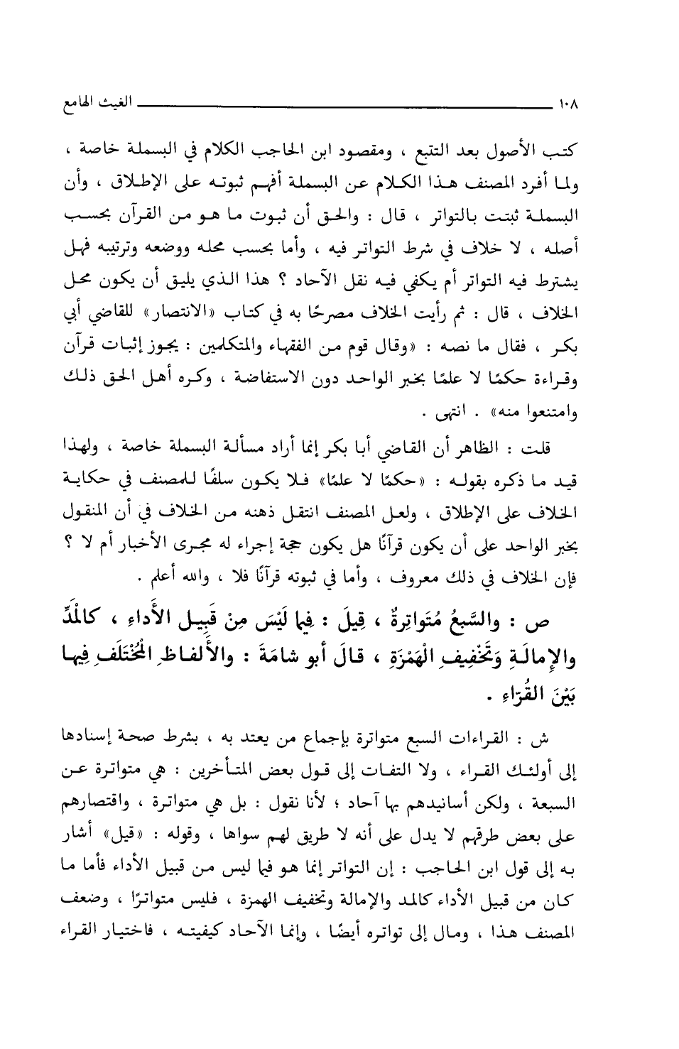 كتب الأصول بعد التتبع، ومقصود ابن الحاجب الكلام في البسملة خاصة، ولما أفرد المصنف هذا الكلام عن البسملة أفهم ثبوته على الإطلاق، وأن البسملة ثبتت بالتواتر، قال: والحق أن ثبوت ما هو من القرآن بحسب أصله، لا خلاف في شرط التواتر فيه، وأما بحسب محله ووضعه وترتيبه فهل يشترط فيه التواتر أم يكفي فيه نقل الآحاد؟ هذا الذي يليق أن يكون محل الخلاف, قال: ثم رأيت الخلاف/ (٢٤أ/م) مصرحاً به في كتاب (الانتصار) للقاضي أبي بكر، فقال ما نصه: (وقال قوم من الفقهاء والمتكلمين: يجوز إثبات قرآن وقراءة حكما لا علماً بخبر الواحد دون الاستفاضة، وكره أهل الحق ذلك وامتنعوا منه) انتهى.