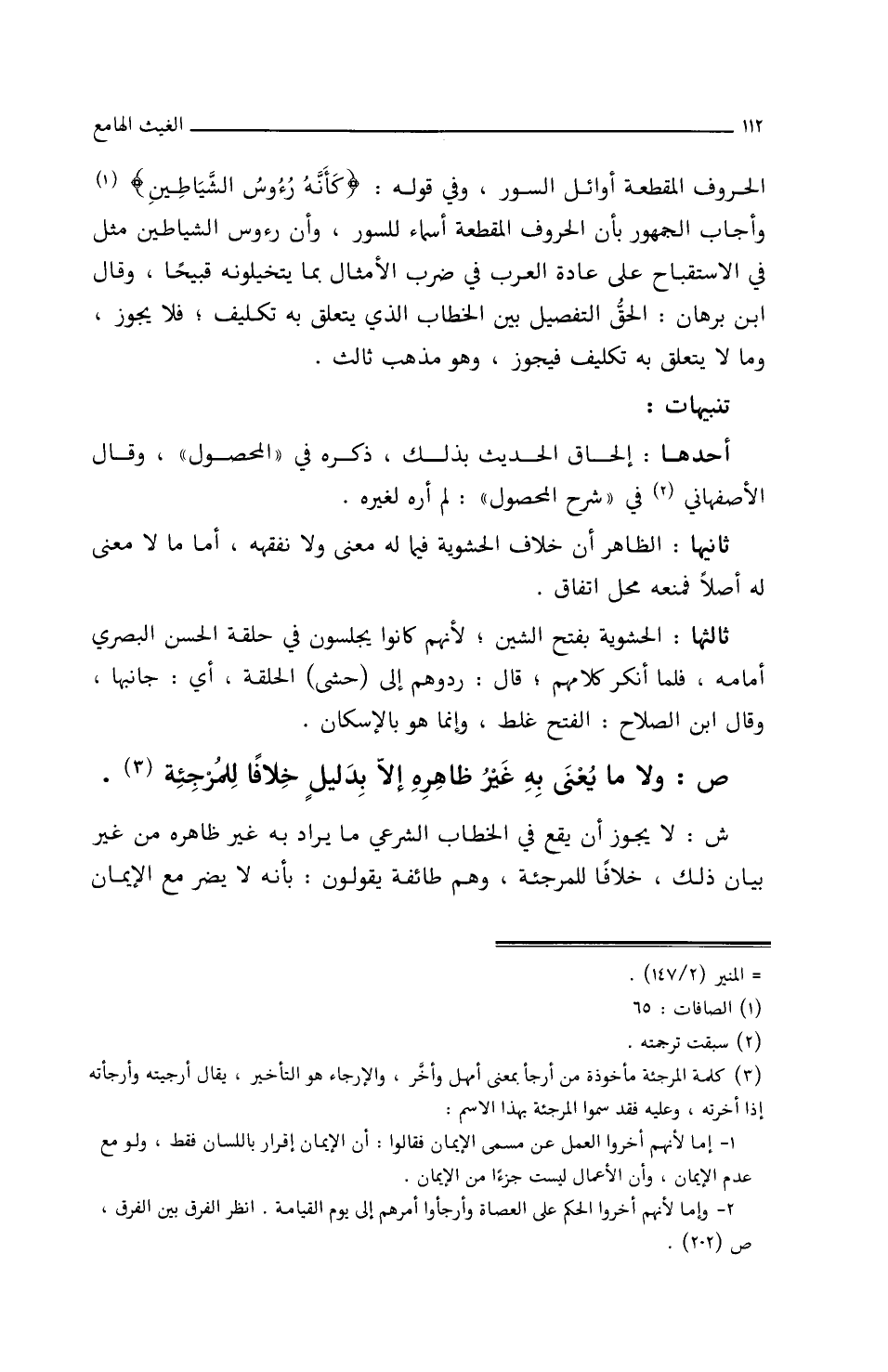 ش: لا يجوز أن يقع في الخطاب الشرعي ما يراد به غير ظاهره من غير بيان ذلك، خلافاً للمرجئة، وهم طائفة يقولون: بأنه لا يضر مع الإيمان
