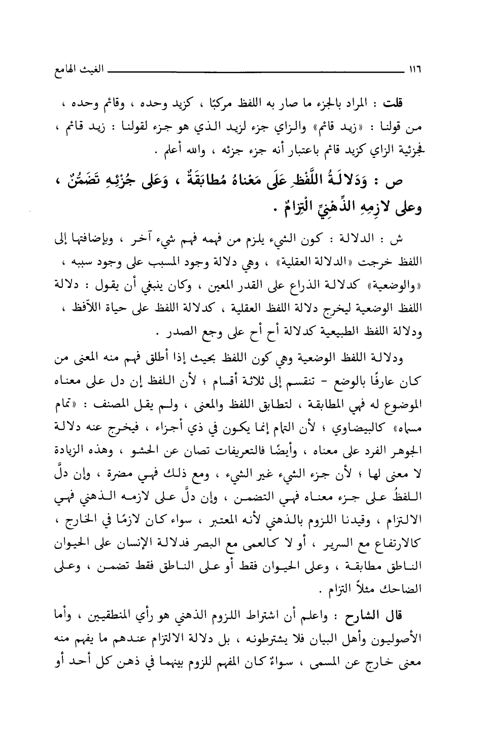 قال الشارح: واعلم أن اشتراط اللزوم الذهني هو رأي المنطقيين، وأما الأصوليون وأهل البيان فلا يشترطونه، بل دلالة الالتزام عندهم ما يفهم منه معنى خارج عن المسمى، سواء كان المفهم للزوم بينهما في ذهن كل أحد أو
