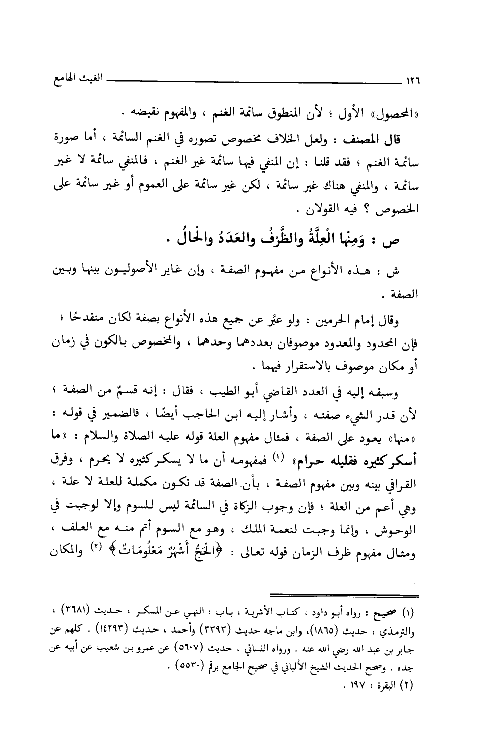 وسبقه إليه في العدد القاضي أبو الطيب، فقال: إنه قسم من الصفة، لأن قدر الشيء صفته، وأشار إليه ابن الحاجب أيضاً، فالضمير في قوله: (منها) يعود على الصفة، فمثال مفهوم العلة قوله عليه الصلاة والسلام: ((ما أسكر كثيره فقليله حرام)) فمفهومه أن ما لا يسكر كثيره لا يحرم، وفرق القرافي بينه وبين مفهوم الصفة، بأن الصفة قد تكون مكملة للعلة لا علة، وهي أعم من العلة، فإن وجوب الزكاة في السائمة ليس للسوم وإلا لوجبت في الوحوش، وإنما/ (٢٩/ أ/ م) وجبت لنعمة الملك، وهو مع السوم أتم/ (٢٤ب/د) منه مع العلف، ومثال مفهوم ظرف الزمان قوله تعالى: {الحج أشهر معلومات} والمكان