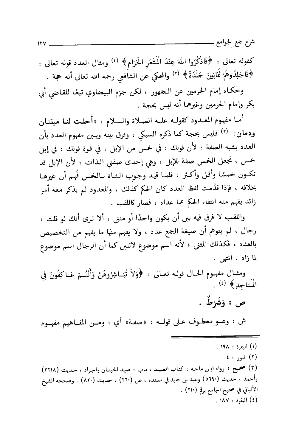 كقوله تعالى: {فاذكروا الله عند المشعر الحرام} ومثال العدد قوله تعالى: {فاجلدوهم ثمانين جلدة} والمحكي عن الشافعي رحمه الله تعالى أنه حجة.