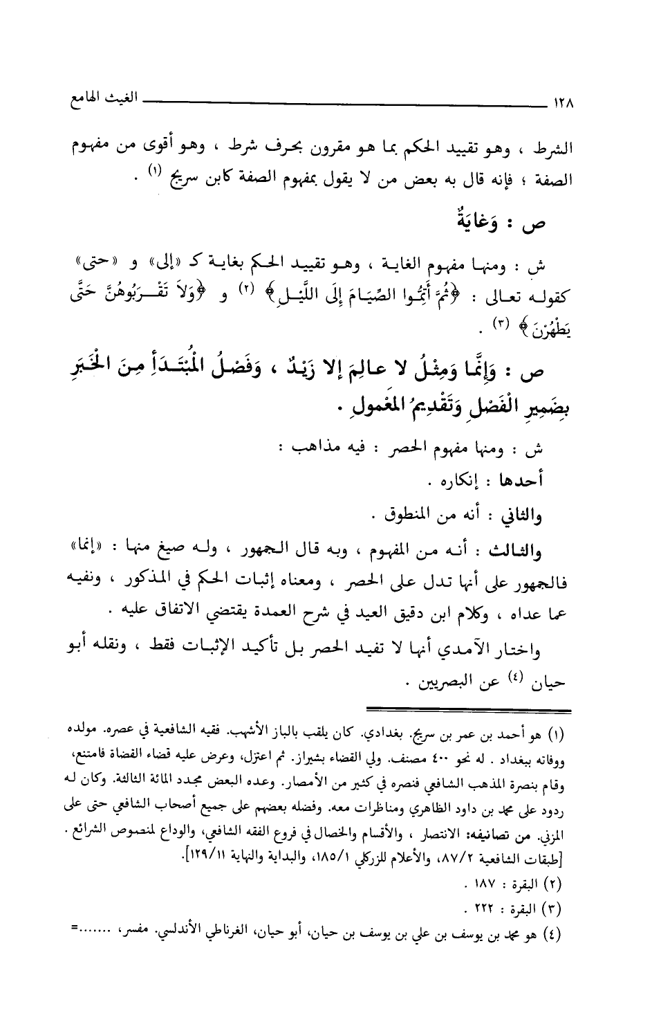 ش: ومنها مفهوم الغاية، وهو تقييد الحكم بغاية كـ (إلى) و (حتى) كقوله تعالى: {ثم أتموا الصيام إلى الليل} و {ولا تقربوهن حتى يطهرن}.