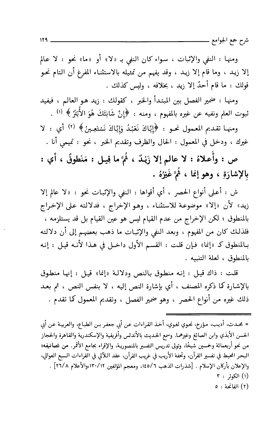 ش: أعلى أنواع الحصر، أي أقواها النفي والإثبات نحو: (لا عالم إلا زيد) لأن (إلا) موضوعة للاستثناء، وهو الإخراج، فدلالته على الإخراج بالمنطوق، لكن الإخراج من عدم القيام ليس هو عين القيام، بل قد يستلزمه فلذلك كان من المفهوم، وبعد النفي والإثبات ما ذهب بعضهم إلى أن دلالته بالمنطوق كـ (إنما) فإن قلت: القسم الأول داخل في هذا لأنه قيل: إنه بالمنطوق، لعلة التنبيه.