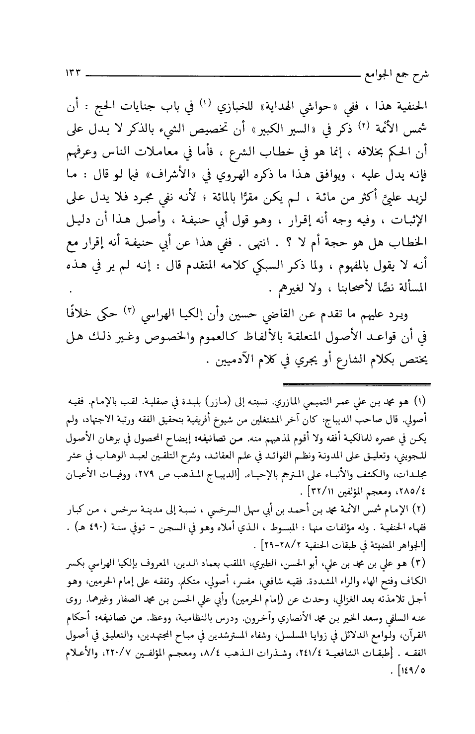 الحنفية هذا ففي (حواشي الهداية) للخبازي في باب جنايات الحج: أن شمس الأئمة ذكر في (السير الكبير) أن تخصيص الشيء بالذكر لا يدل على أن الحكم بخلافه، إنما هو في خطاب الشرع، فأما في معاملات الناس وعرفهم فإنه يدل عليه، ويوافق هذا ما ذكره الهروي في (الأشراف) فيما لو قال/ ٣٠/ب/م): ما لزيد علي أكثر من مائة، لم يكن مقرا بالمائة، لأنه نفي مجرد فلا يدل على الإثبات، وفيه وجه أنه إقرار وهو قول أبي حنيفة وأصل هذا أن دليل الخطاب هل هو حجة أم لا؟ انتهى، ففي هذا عن أبي حنيفة أنه إقرار مع أنه لا يقول بالمفهوم، ولما ذكر السبكي كلامه المتقدم قال: إنه لم ير في هذه المسألة نصاً لأصحابنا، ولا لغيرهم.