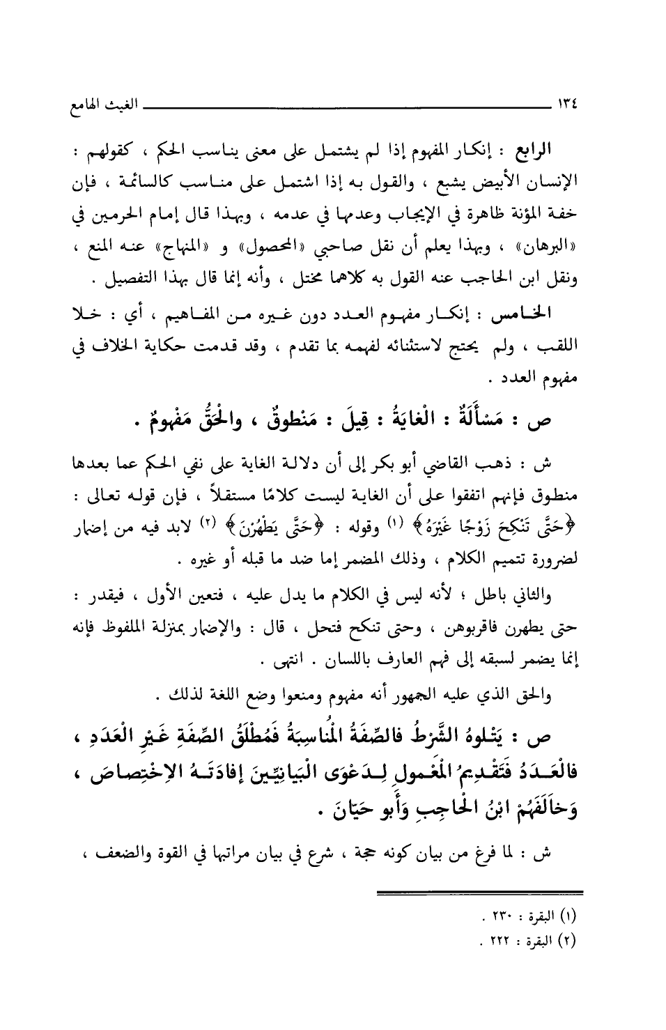 ش:/ (٢٦/أ/د) ذهب القاضي أبو بكر إلى أن دلالة الغاية على نفي الحكم عما بعدها منطوق فإنهم اتفقوا على أن الغاية ليست كلاماً مستقلاً، فإن قوله تعالى {حتى تنكح زوجاً غيره} وقوله {حتى يطهرن} لابد فيه من إضمار لضرورة تتميم الكلام، وذلك المضمر إما ضد ما قبله أو غيره.