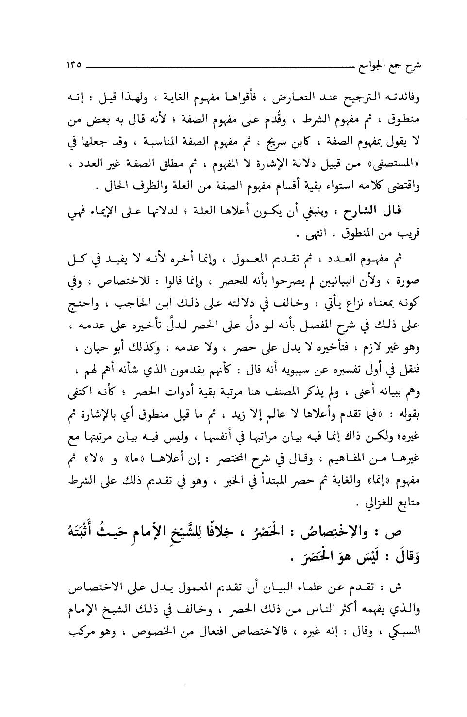 ش: تقدم عن علماء البيان أن تقديم المعمول يدل على الاختصاص/ (٢٦/ب/د) والذي يفهمه أكثر الناس من ذلك الحصر، وخالف في ذلك الشيخ الإمام السبكي، وقال: إنه غيره، فالاختصاص افتعال من الخصوص، وهو مركب