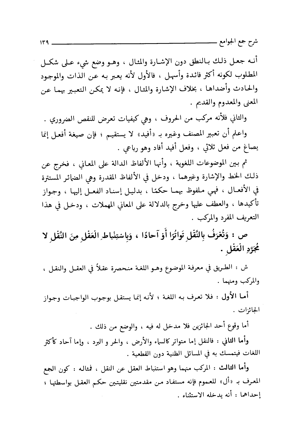 وأما الثالث: المركب منهما وهو استنباط العقل عن النقل، فمثاله: كون الجمع المعرف بـ (أل) للعموم فإنه مستفاد من مقدمتين نقليتين حكم العقل بواستطها، إحداهما: أنه يدخله الاستثناء.