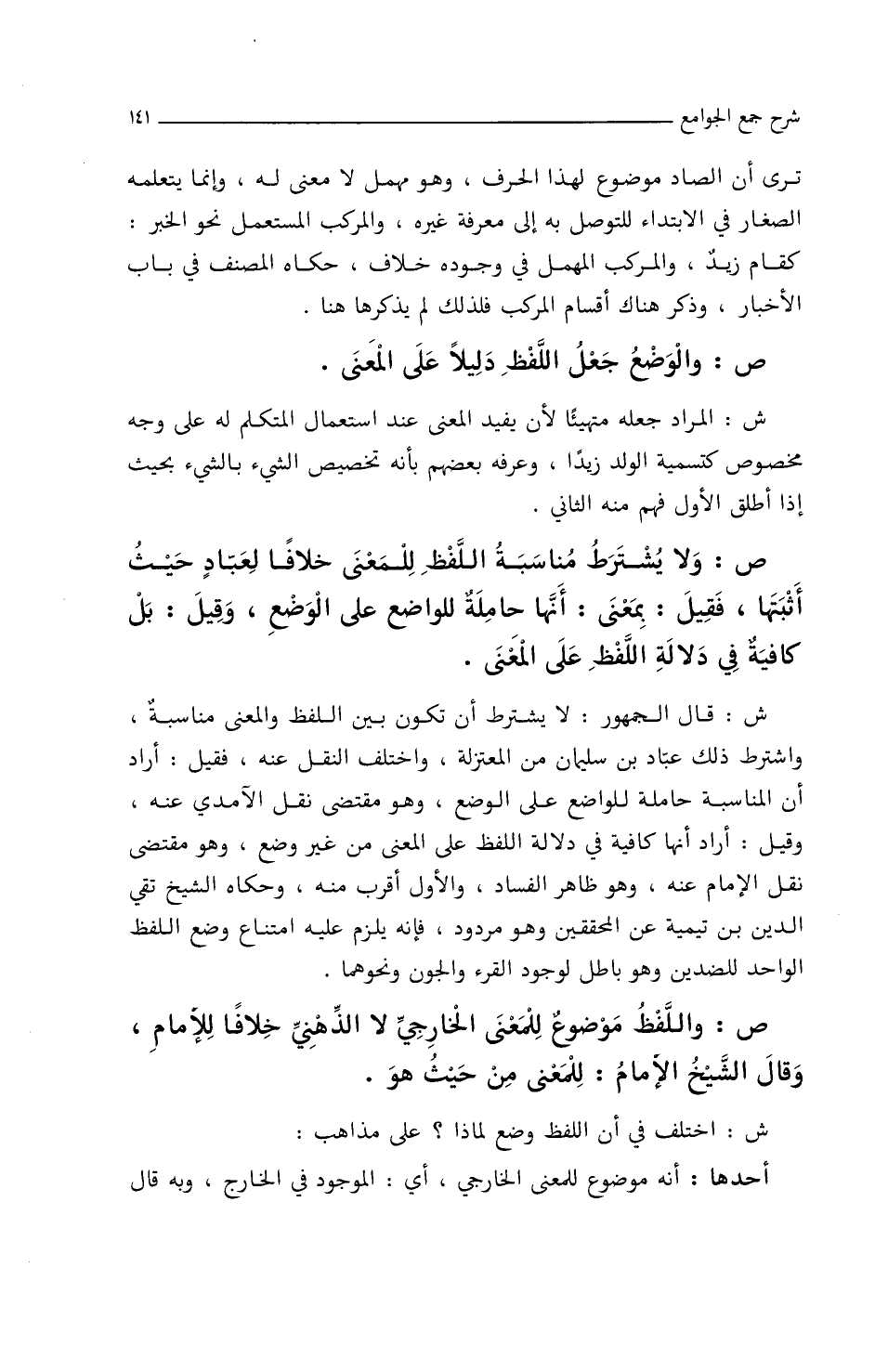 ص: واللفظ موضوع للمعنى الخارجي لا الذهني خلافاً للإمام، وقال الشيخ الإمام: للمعنى من حيث هو.