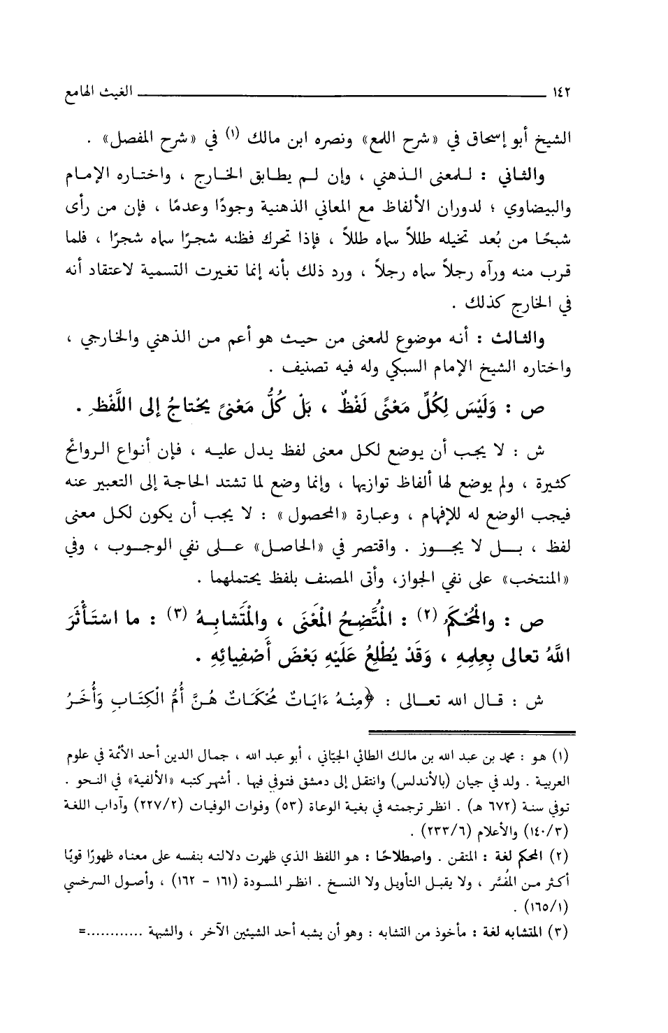 ص: والمحكم: المتضح المعنى، والمتشابه: ما استأثر الله تعالى بعلمه، وقد يطلع عليه بعض أصفيائه.