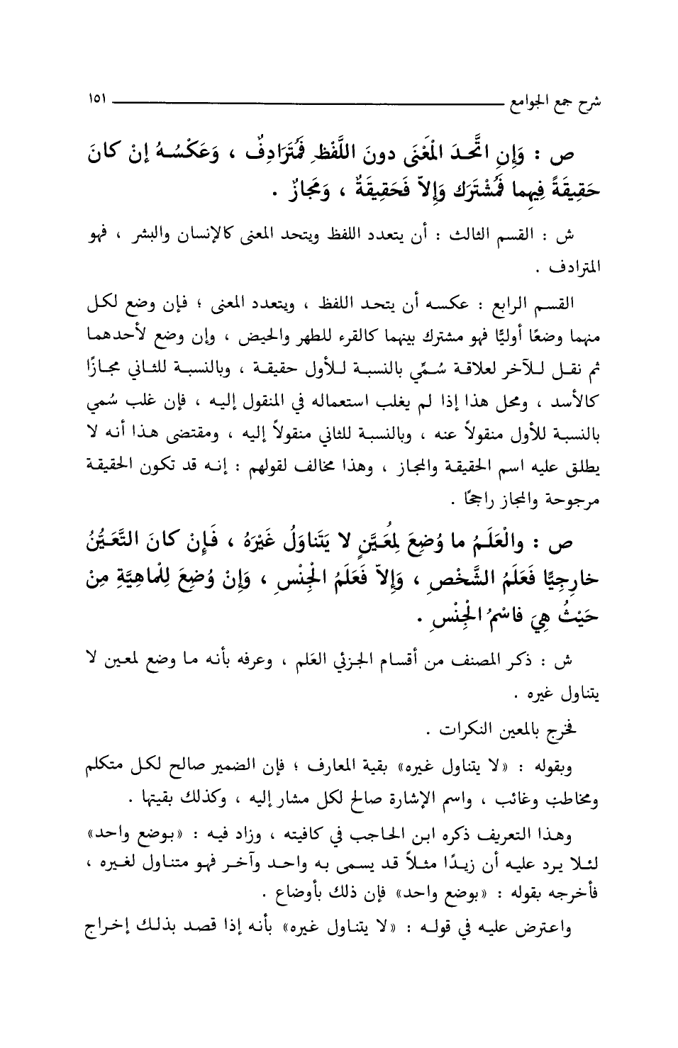 القسم الرابع: عكسه أن يتحد اللفظ، ويتعدد المعنى، فإن وضع لكل منهما وضعاً أولياً فهو مشترك بينهما كالقرء للطهر والحيض، وإن وضع لأحدهما ثم نقل للآخر لعلاقة سمي بالنسبة للأول حقيقة، وبالنسبة للثاني مجازاً كالأسد، ومحل هذا إذا لم يغلب استعماله في المنقول/ (٣٦/ب/م) إليه فإن غلب سمي بالنسبة للأول منقولاً عنه، وبالنسبة للثاني منقولاً إليه، ومقتضى هذا أنه لا يطلق عليه اسم الحقيقة والمجاز، وهذا مخالف لقولهم: إنه قد تكون الحقيقة مرجوحة والمجاز راجحاً.