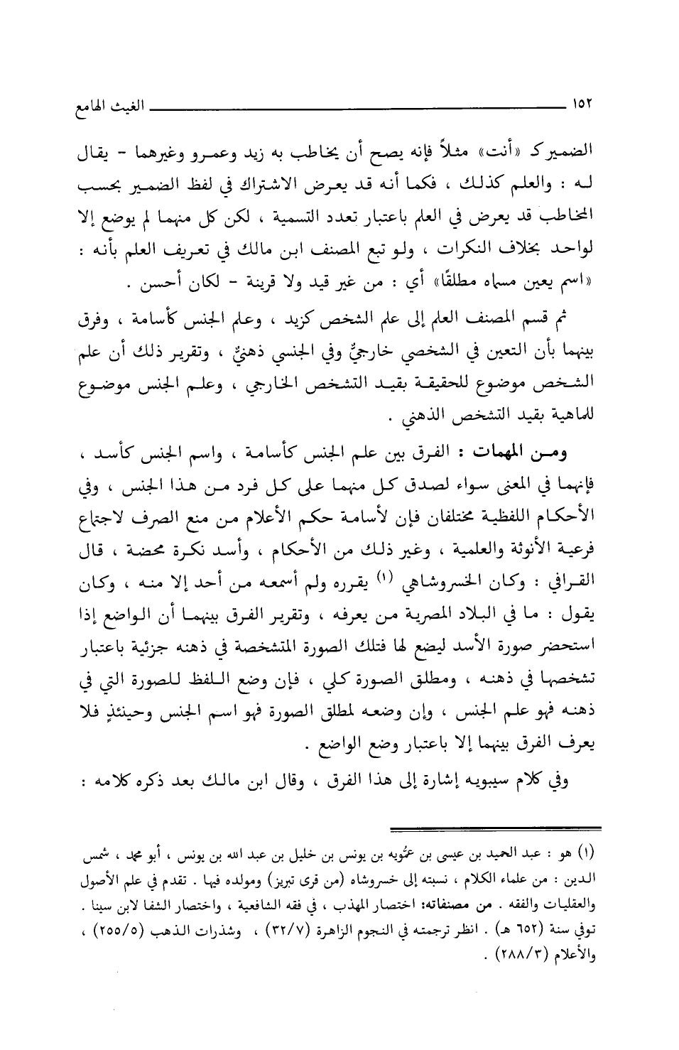 ومن المهمات: الفرق بين علم الجنس كأسامة، واسم الجنس كأسد، فإنهما في المعنى سواء لصدق كل منهما على كل فرد من هذا الجنس، وفي الأحكام اللفظية مختلفان فإن لأسامة حكم الأعلام من منع الصرف لاجتماع فرعية الأنوثة والعلمية/ (٣١/أ/د) وغير ذلك من الأحكام، وأسد نكرة محضة، قال القرافي: وكان الخسروشاهي يقرره ولم أسمعه من أحد إلا منه، / (٣٧/أ/ م) وكان يقول: ما في البلاد المصرية من يعرفه، وتقرير الفرق بينهما أن الواضع إذا استحضر صورة الأسد ليضع لها فتلك الصورة المتشخصة في ذهنه جزئية باعتبار تشخصها في ذهنه، ومطلق الصورة كلي، فإن وضع اللفظ للصورة التي في ذهنه فهو علم الجنس، وإن وضعه لمطلق الصورة فهم اسم الجنس/ وحينئذ فلا يعرف الفرق بينهما إلا باعتبار وضع الواضع.