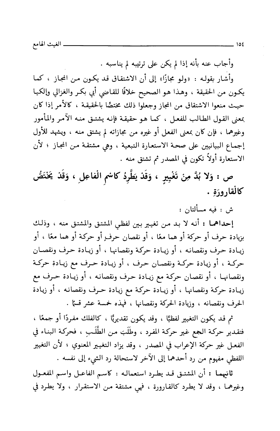 إحداهما: أنه لا بد من تغيير بين لفظي المشتق والمشتق منه، وذلك بزيادة حرف أو حركة أو هما معاً، أو نقصان حرف أو حركة أو هما معاً، أو زيادة حرف ونقصانه، أو زيادة حركة ونقصانها، أو زيادة حرف ونقصان حركة، أو زيادة حركة ونقصان حرف، أو زيادة حرف مع زيادة حركة ونقصانها، أو نقصان حركة مع زيادة حرف ونقصانه، أو زيادة حرف مع زيادة حركة ونقصانها، أو زيادة حركة مع زيادة حرف ونقصانه، أو زيادة الحرف ونقصانه، وزيادة الحركة ونقصانها، فهذه خمسة عشر قسماً.