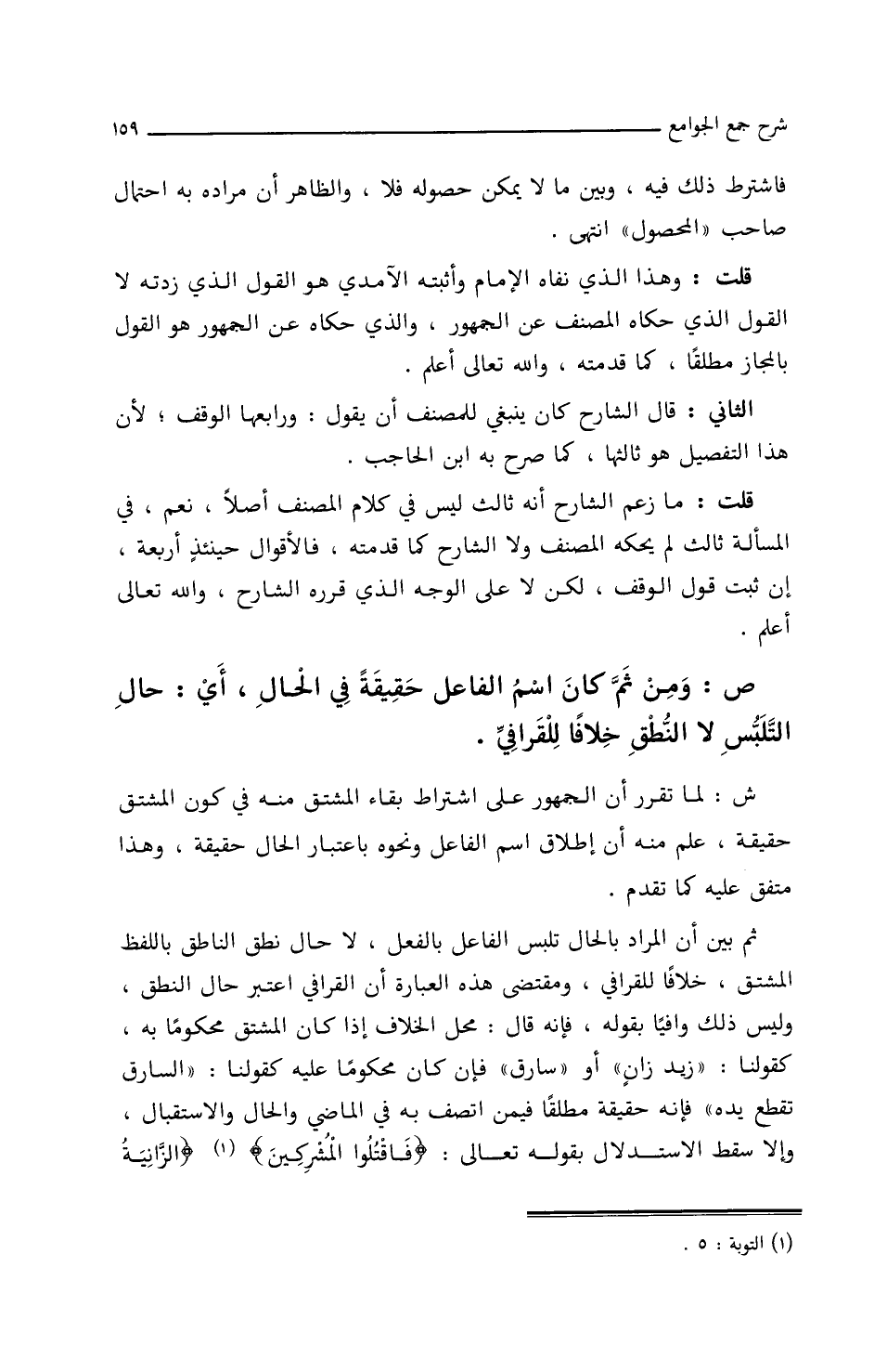 ثم بين أن المراد بالحال حال تلبس الفاعل بالفعل، لا حال نطق الناطق باللفظ المشتق، خلافاً للقرافي، ومقتضى هذه العبارة أن القرافي اعتبر حال النطق، وليس ذلك وافياً بقوله، فإنه قال: محل الخلاف إذا كان المشتق محكوماً به، كقولنا: (زيد زان) أو (سارق) فإن كان محكوماً عليه كقولنا: (السارق تقطع يده) فإنه حقيقة مطلقاً فيمن اتصف به في الماضي والحال والاستقبال، وإلا سقط الاستدلال بقوله تعالى: {فاقتلوا المشركين} {الزانية