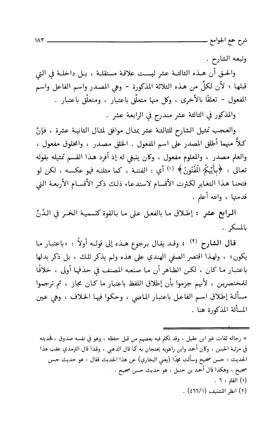 والعجب تمثيل الشارح للثالثة عشر بمثال موافق لمثال الثانية عشرة، فإن كلا منهما أطلق المصدر على اسم المفعول، الخلق مصدر، والمخلوق مفعول، والعلم مصدر، والمعلوم مفعول، وكان ينبغي له إذ أفرد هذا القسم تمثيله بقوله تعالى {بأييكم المفتون} أي/ ٣٨ ب/ د) الفتنة كما مثلته فهو عكسه، لكن لو فتحنا هذا التغاير لكثرت الأقسام لاستدعاء ذلك ذكر الأقسام الأربعة التي قدمتها، والله أعلم.