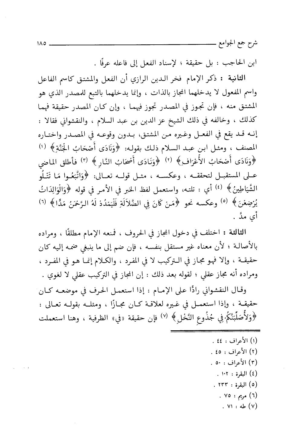 وقال النقشواني راداً على الإمام: إذا استعمل الحرف في موضعه كان حقيقة، وإذا استعمل في غيره لعلاقة كان مجازاً، ومثله بقوله تعالى: {ولأصلبنكم في جذوع النخل} فإن حقيقة (في) الظرفية، وهنا استعملت