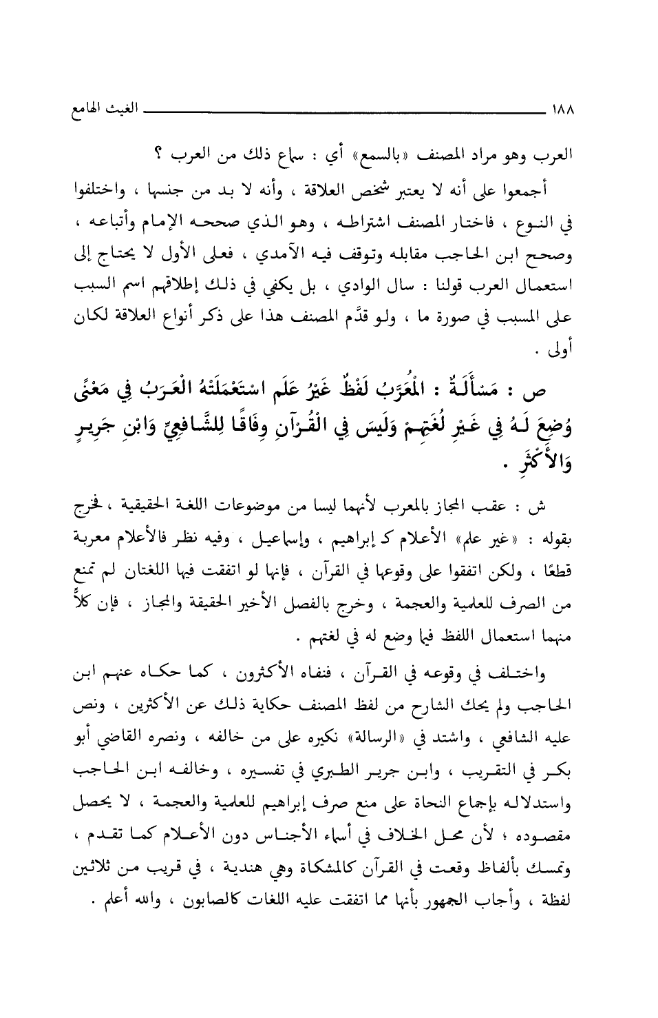 ونص عليه الشافعي، واشتد في (الرسالة) نكيره على من خالفه، ونصره القاضي أبو بكر في / (٤٠/ أ / د) التقريب، وابن جرير الطبري في تفسيره، وخالفه ابن الحاجب واستدلاله بإجماع النحاة على منع صرف إبراهيم للعلمية والعجمة، لا يحصل مقصوده، لأن محل الخلاف في أسماء الأجناس دون الأعلام كما تقدم، وتمسك بألفاظ وقعت في القرآن كالمشكاة وهي هندية، في قريب من ثلاثين لفظة، وأجاب الجمهور بأنها مما اتفقت عليه اللغات كالصابون، والله أعلم.
