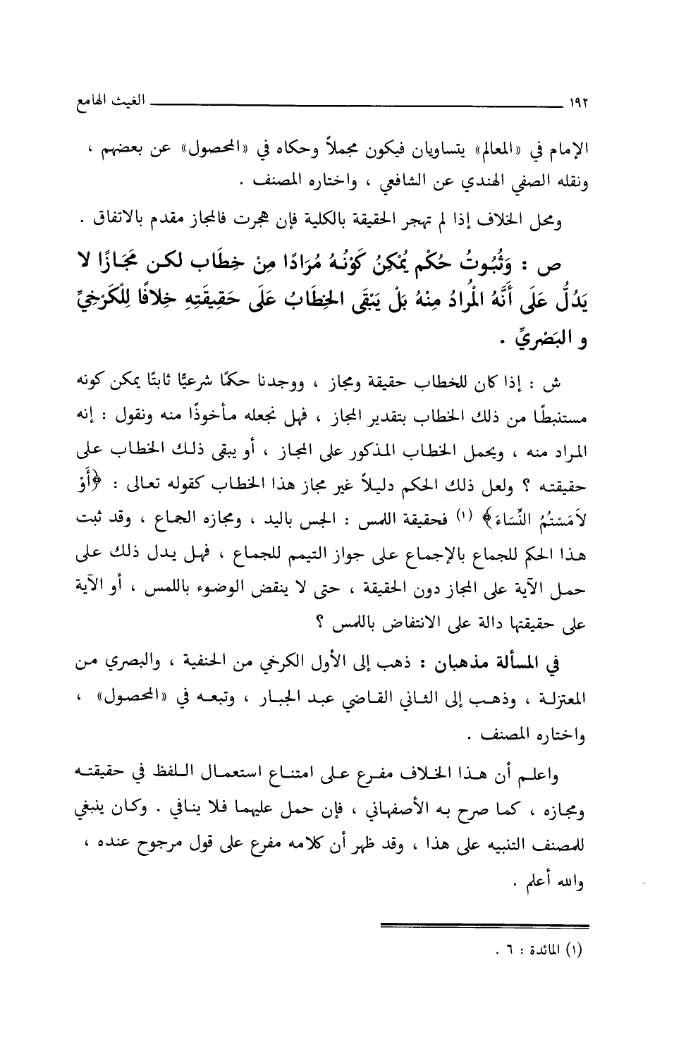 ش: إذا كان للخطاب حقيقة ومجاز، ووجدنا حكماً شرعياً ثابتاً يمكن كونه مستنبطاً من ذلك الخطاب بتقدير المجاز، فهل نجعله مأخوذاً منه ونقول: إنه المراد منه ويحمل الخطاب المذكور على المجاز، أو يبقى ذلك الخطاب على حقيقته؟ ولعل لذلك الحكم دليلاً غير مجاز هذا الخطاب كقوله تعالى: {أو لامستم النساء} فحقيقة اللمس الجس باليد، ومجازه الجماع، وقد ثبت هذا الحكم للجماع بالإجماع على جواز التيمم للجماع، فهل يدل ذلك على حمل الآية على المجاز دون الحقيقة، حتى لا ينقض الوضوء باللمس أو الآية على حقيقتها دالة على الانتقاض باللمس؟