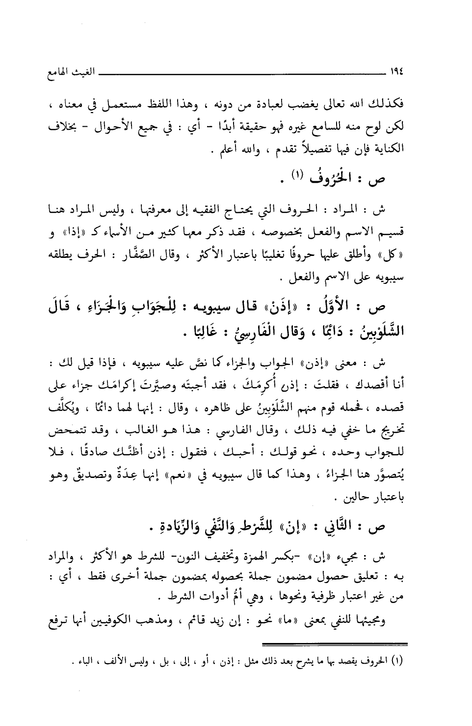 ش: المراد الحروف التي يحتاج الفقيه إلى معرفتها، وليس المراد هنا قسيم الاسم والفعل بخصوصه، فقد ذكر معها كثير من الأسماء كـ (إذا) و (كل) وأطلق عليها حروفاً تغليباً باعتبار الأكثر، وقال الصفار: الحرف يطلقه سيبويه على الاسم والفعل.