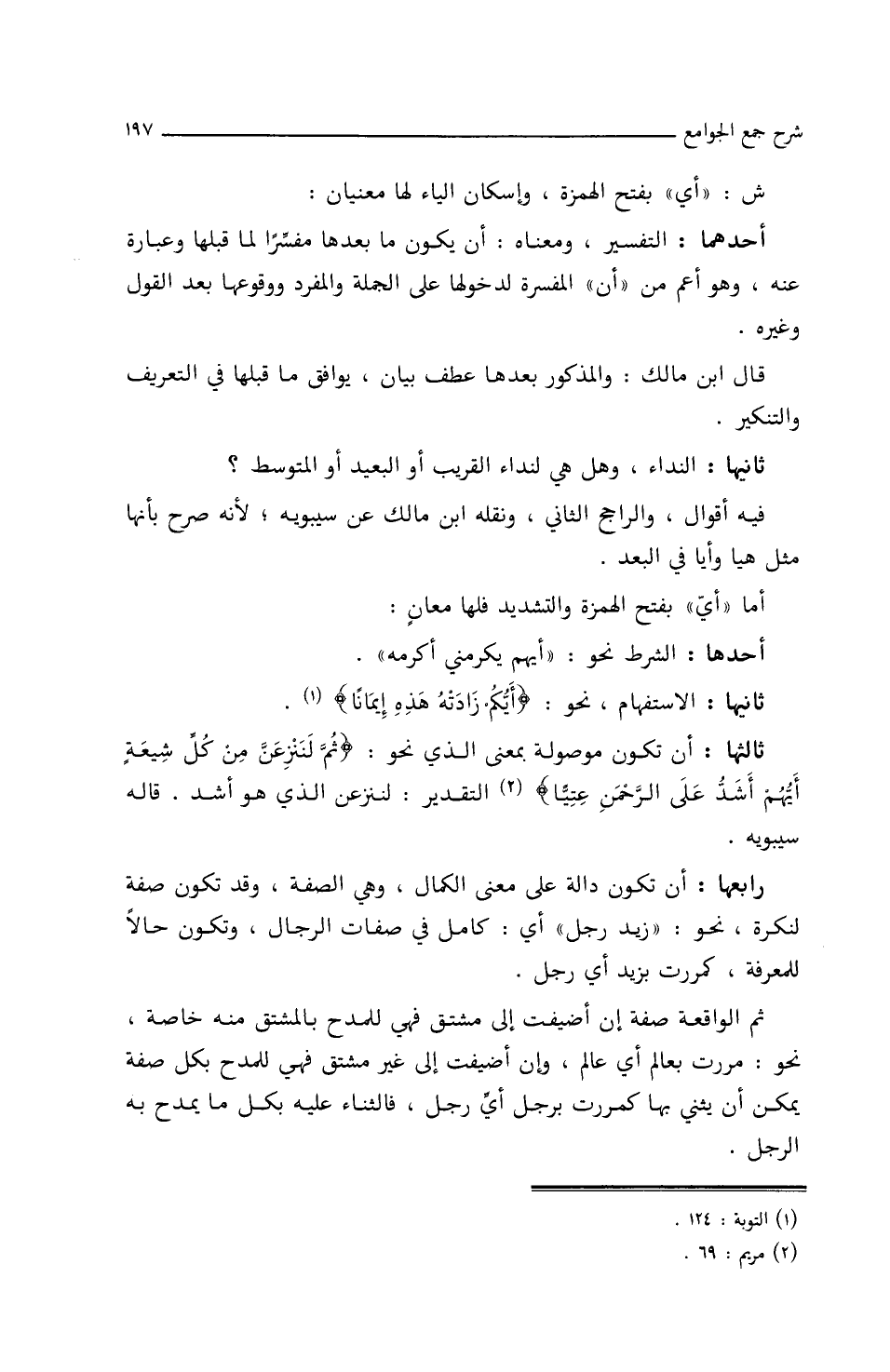 ثم الواقعة صفة إن أضيفت إلى مشتق فهي للمدح بالمشتق منه خاصة، نحو: مررت بعالم أي عالم، وإن أضيفت إلى غير مشتق فهي للمدح بكل صفة يمكن أن يثنى بها كمررت برجل أي رجل، فالثناء / (٥٣/ أ / م) عليه بكل ما يمدح به الرجل.