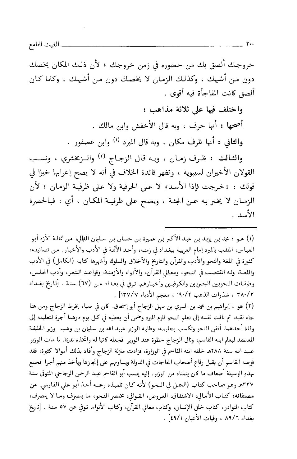 والثالث: ظرف زمان، وبه قال الزجاج والزمخشري، ونسب القولان الأخيران لسيبويه، وتظهر فائدة الخلاف في أنه لا يصح إعرابها خبراً في قولك: (خرجت فإذا الأسد) لا على الحرفية ولا على ظرفية الزمان، لأن الزمان لا يخبر به عن الجثة، ويصح على ظرفية المكان أي فبالحضرة الأسد.