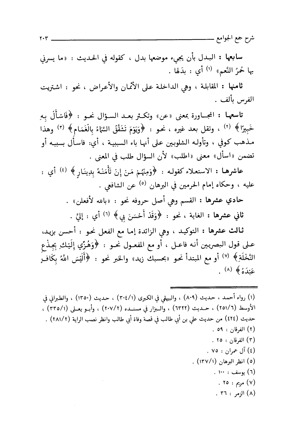 ثالث عشرها: التوكيد، وهي الزائدة إما مع الفعل نحو: أحسن بزيد، على قول البصريين أنه فاعل، أو مع المفعول نحو: {وهزي إليك بجذع النخلة} أو مع المبتدأ نحو (بحسبك زيد) والخبر نحو: {أليس الله بكاف عبده}.