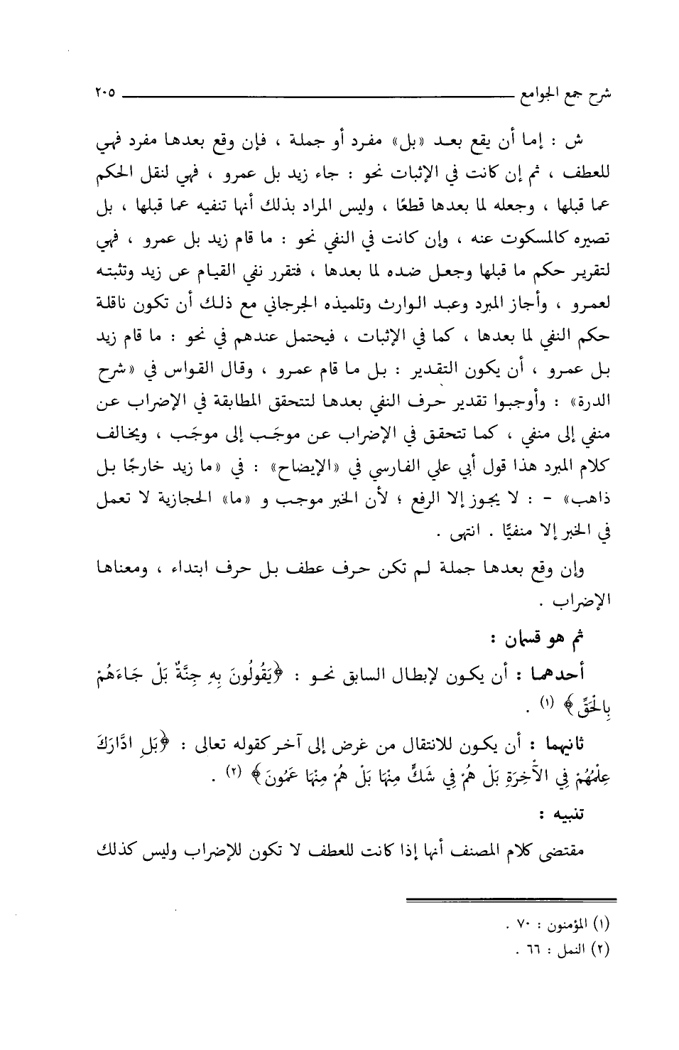 ش: إما أن يقع بعد (بل) مفرد أو جملة، فإن وقع بعدها مفرد فهي للعطف، ثم إن كانت في الإثبات نحو: جاء زيد بل عمرو، فهي لنقل الحكم عما قبلها، وجعله لما بعدها قطعاً، وليس المراد بذلك أنها تنفيه عما قبلها، بل تصيره كالمسكوت عنه، وإن كانت في النفي نحو ما قام زيد بل عمرو، فهي لتقرير حكم ما قبلها وجعل ضده لما بعدها، فتقرر نفي القيام عن زيد وتثبته لعمرو، وأجاز المبرد وعبد الوارث وتلميذه الجرجاني مع ذلك أن تكون ناقلة حكم النفي لما بعدها، كما في الإثبات، فيحتمل عندهم/ (٥٥أ/ م) في نحو: ما قام زيد بل عمرو، أن يكون التقدير بل ما قام عمرو، وقال القواس في (شرح الدرة): وأوجبوا تقدير حرف النفي بعدها لتتحقق المطابقة في الإضراب عن منفي إلى منفي، كما تتحقق في الإضراب عن موجب إلى موجب، ويخالف كلام المبرد هذا قول أبي علي الفارسي في (الإيضاح): في (ما زيد خارجاً بل ذاهب) ـ: لا يجوز إلا الرفع، لأن الخبر موجب و (ما) الحجازية لا تعمل في الخبر إلا منفياً، انتهى.