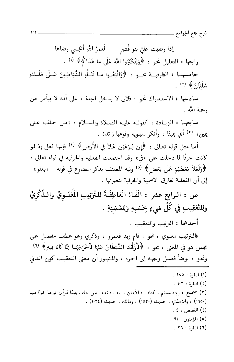 ص: الرابع عشر: الفاء العاطفة للترتيب المعنوي والذكري وللتعقيب في كل شيء بحسبه وللسببية.