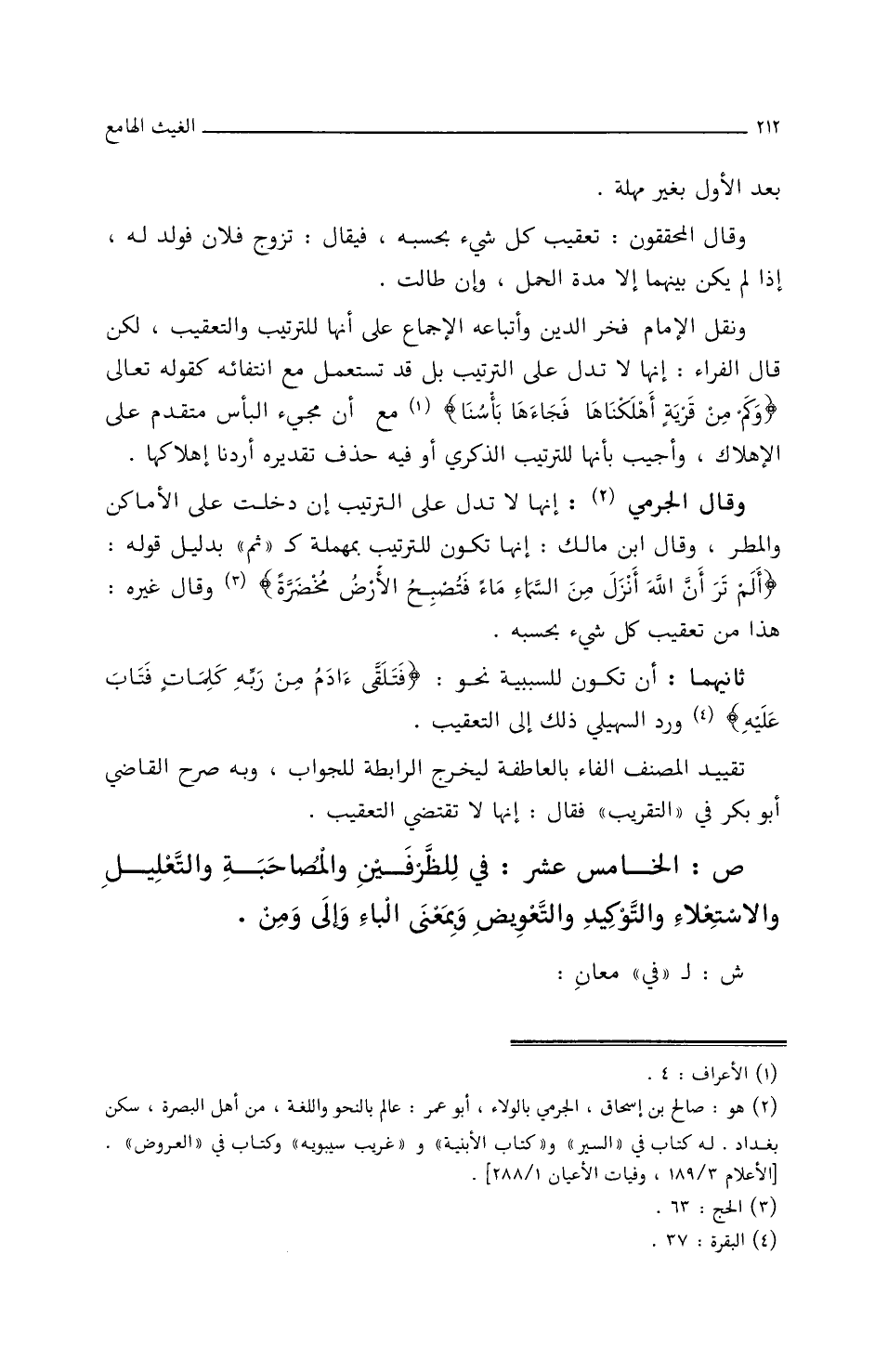 وقال الجرمي: إنها لا تدل على الترتيب إن دخلت على الأماكن والمطر، وقال ابن مالك: إنها تكون للترتيب بمهلة كـ (ثم) بدليل قوله: {ألم تر أن الله أنزل من السماء ماء فتصبح الأرض مخضرة} وقال غيره: هذا من تعقيب كل شيء بحسبه.