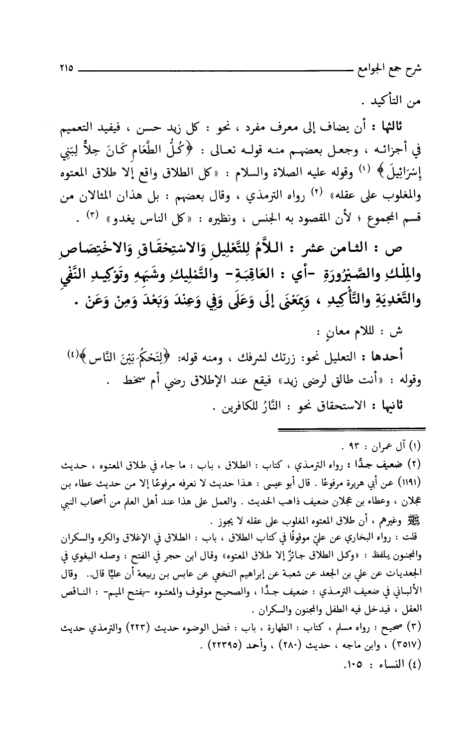 ثالثها: أن يضاف إلى معرف مفرد، نحو: كل زيد حسن، فيفيد التعميم، في أجزائه، وجعل بعضهم منه قوله تعالى: {كل الطعام كان حلا لبني إسرائيل} وقوله عليه الصلاة والسلام: ((كل الطلاق واقع إلا طلاق المعتوه والمغلوب على عقله)) رواه الترمذي وقال بعضهم: بل هذان المثالان من قسم المجموع لأن المقصود به الجنس، ونظيره: (كل الناس يغدو).