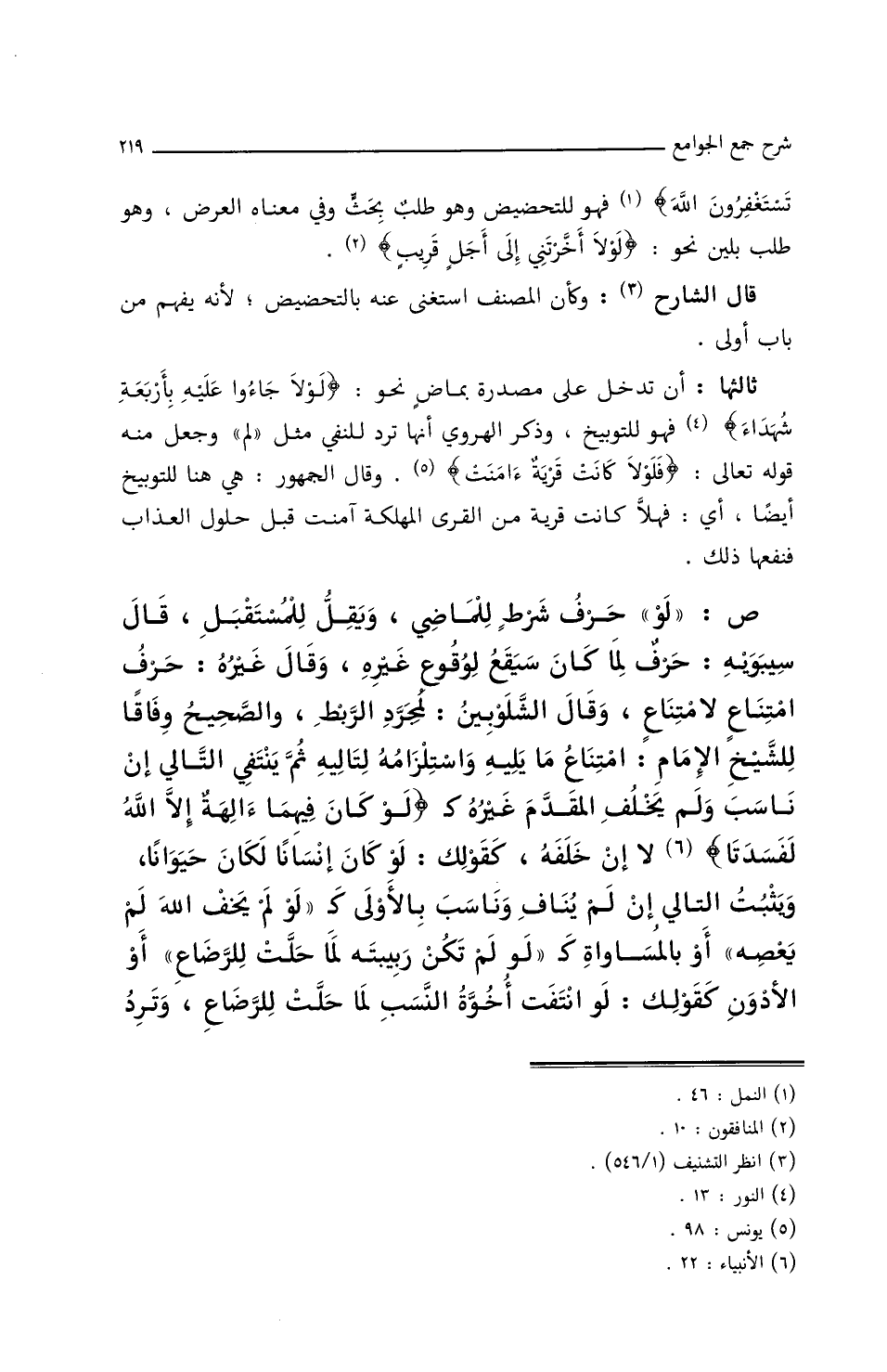 ص: (لو) حرف شرط للماضي، ويقل للمستقبل، قال سيبويه: حرف لما كان سيقع لوقوع غيره، وقال غيره: حرف امتناع لامتناع، وقال الشلوبين: لمجرد الربط، والصحيح وفاقاً للشيخ الإمام: امتناع ما يليه واستلزامه لتاليه ثم ينتفي التالي إن ناسب ولم يخلف المقدم وغيره كـ {لو كان فيهما آلهة إلا الله لفسدتا} لا إن خلفه كقولك لو كان إنساناً لكان حيواناً ويثبت التالي إن لم يناف وناسب بالأولى كـ (لو لم يخف الله لم يعصه) أو بالمساواة كـ (لو لم تكن ربيبته لما حلت للرضاع أو الأدون كقولك: لو انتفت أخوة النسب لما حلت للرضاع وترد