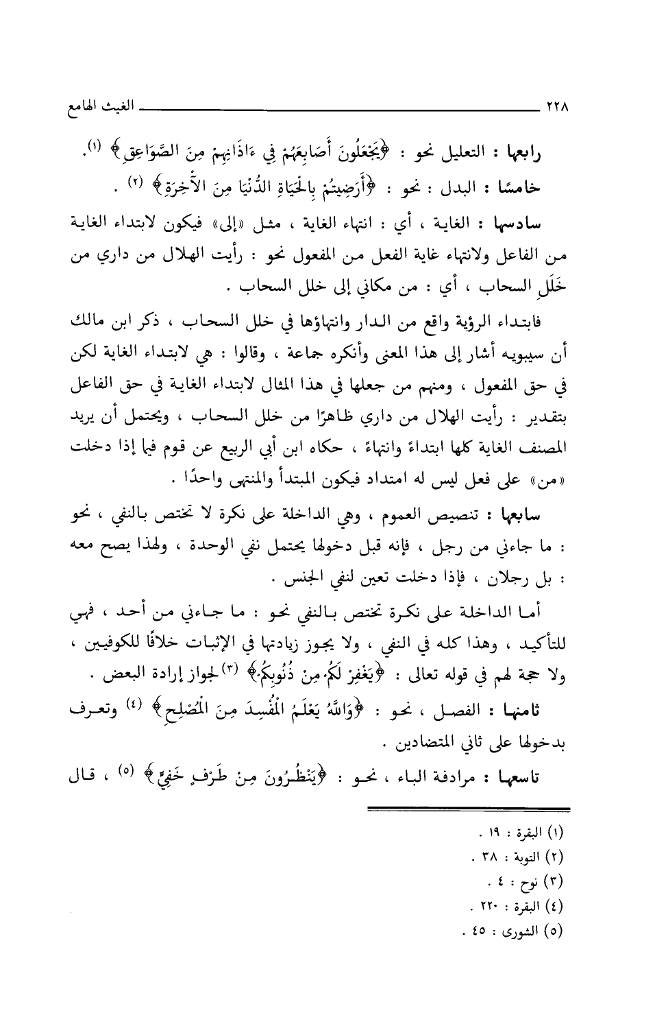 رابعها: التعليل، نحو: {يجعلون أصابعهم في آذانهم من الصواعق}.