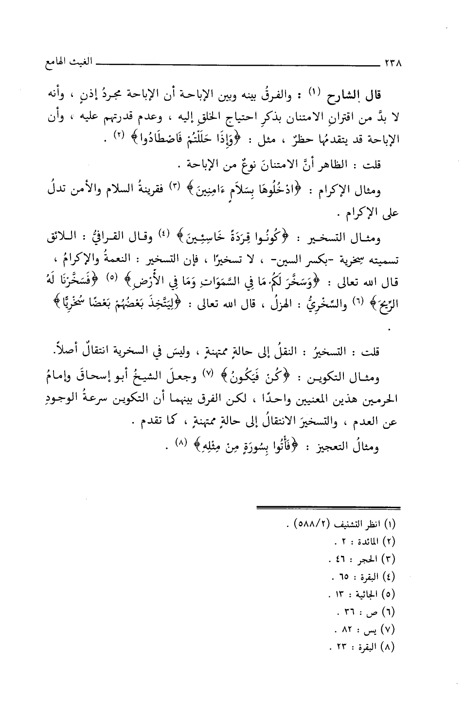 ومثال التكوين: {كن فيكون} وجعل الشيخ أبو إسحاق وإمام الحرمين هذين المعنيين واحداً، لكن الفرق بينهما أن التكوين سرعة الوجود عن العدم، والتسخير الانتقال إلى حالة ممتهنة، كما تقدم.