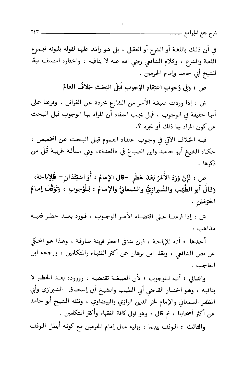 ش: إذا وردت صيغة الأمر / (٦٥/ ب / م) (٥٣أ/ د) من الشارع مجردة عن القرائن، وفرعنا على أنها حقيقة في الوجوب، فهل يجب اعتقاد أن المراد بها الوجوب قبل البحث عن كون المراد بها ذلك أو غيره؟ فيه الخلاف الآتي في وجوب اعتقاد العموم قبل البحث عن المخصص، حكاه الشيخ أبو حامد وابن الصباغ في (العدة) وهي مسالة غريبة قل من ذكرها.