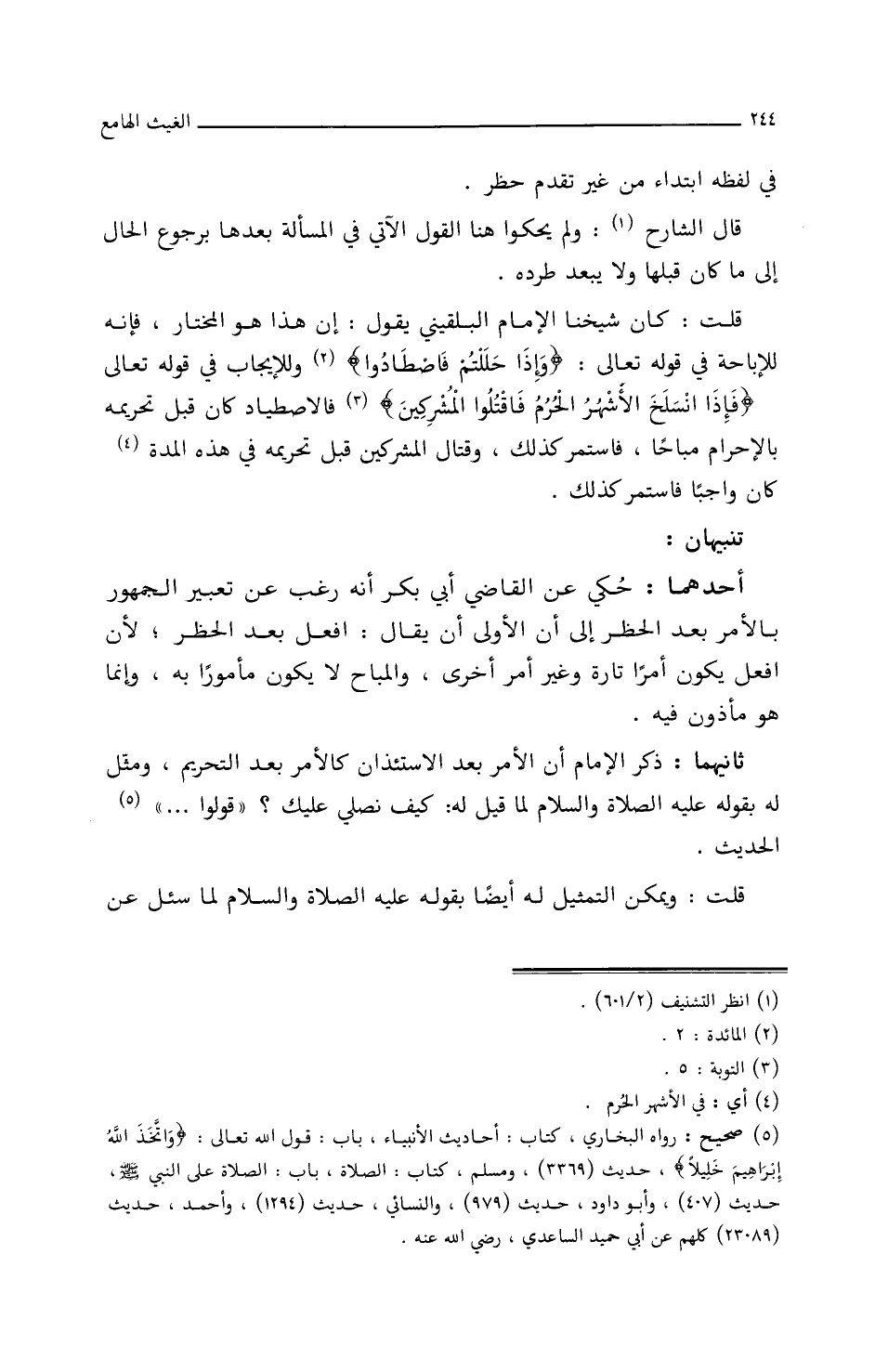 ثانيهما: ذكر الإمام أن الأمر بعد الاستئذان كالأمر بعد التحريم، ومثل له بقوله عليه الصلاة والسلام لما قيل له كيف نصلي عليك: ((قولوا ....)) الحديث.