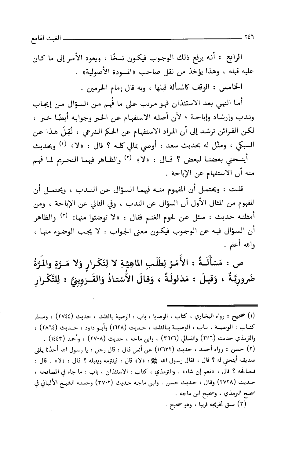 قلت: ويحتمل أن المفهوم منه فيهما السؤال عن الندب، ويحتمل أن المفهوم من المثال الأول أن السؤال عن الندب، وفي الثاني عن الإباحة، ومن أمثلته حديث: سئل عن لحوم الغنم فقال: ((لا توضؤوا منها)) والظاهر أن السؤال فيه عن الوجوب فيكون معنى الجواب: لا يجب الوضوء منها، والله أعلم.